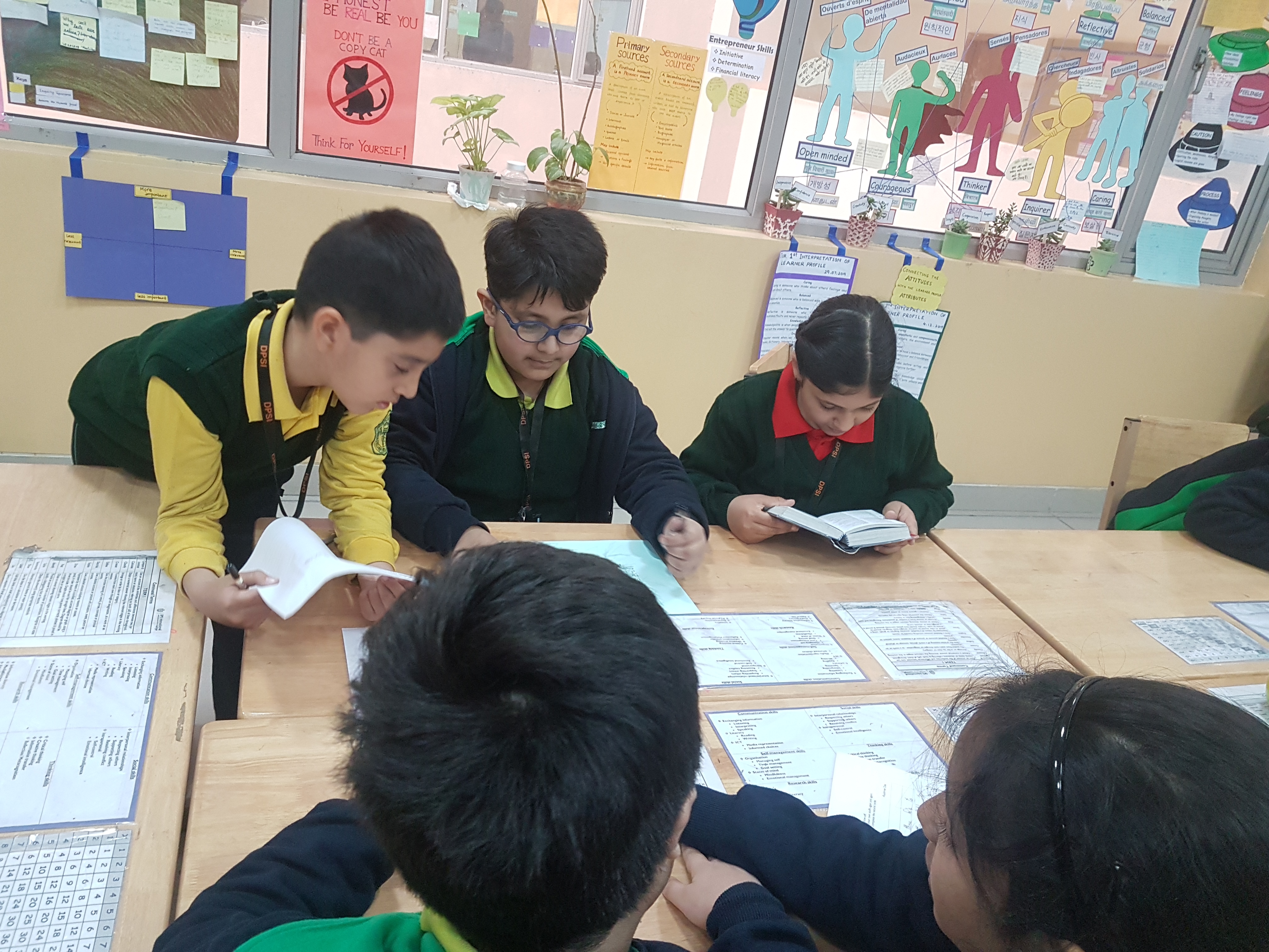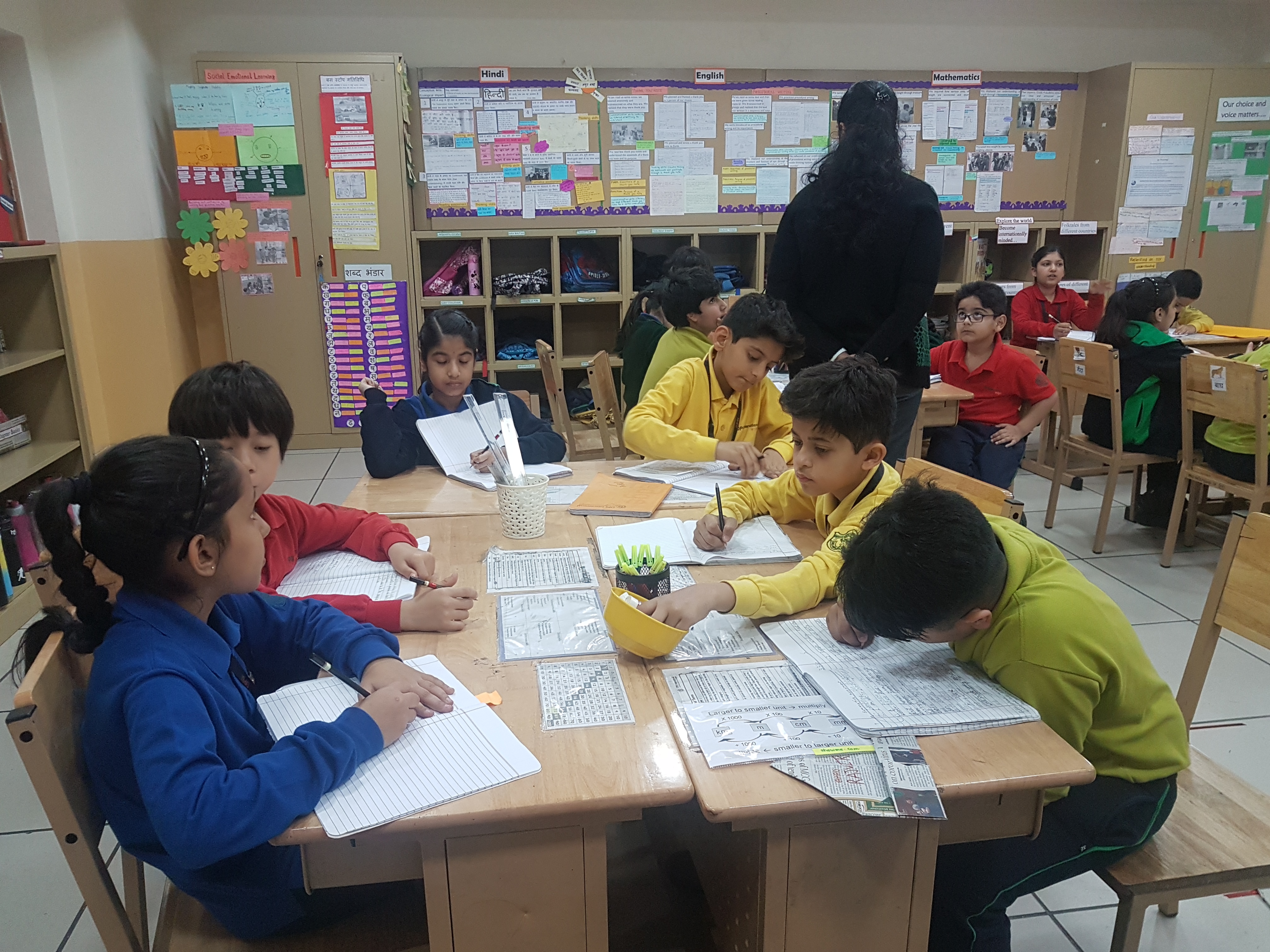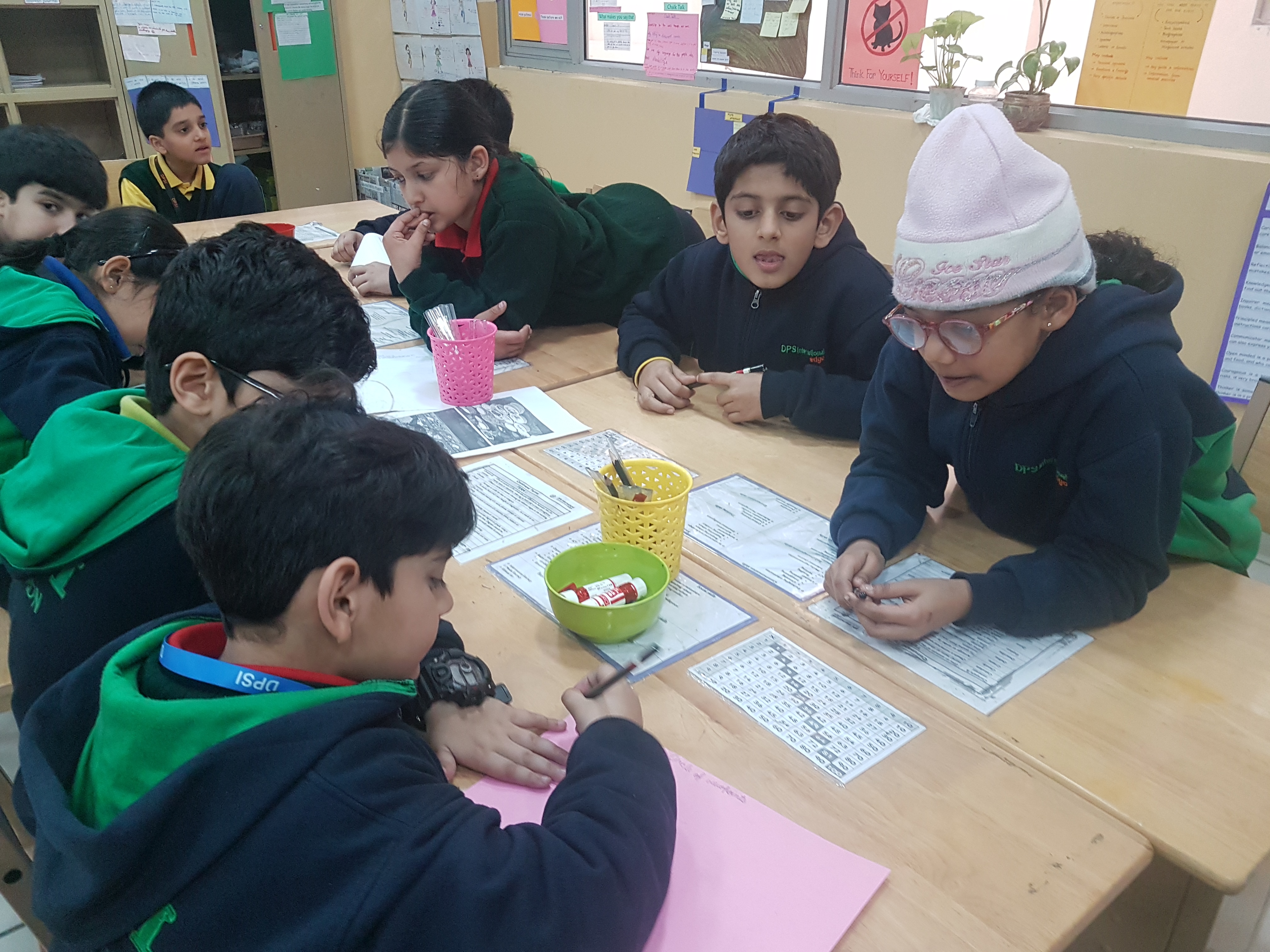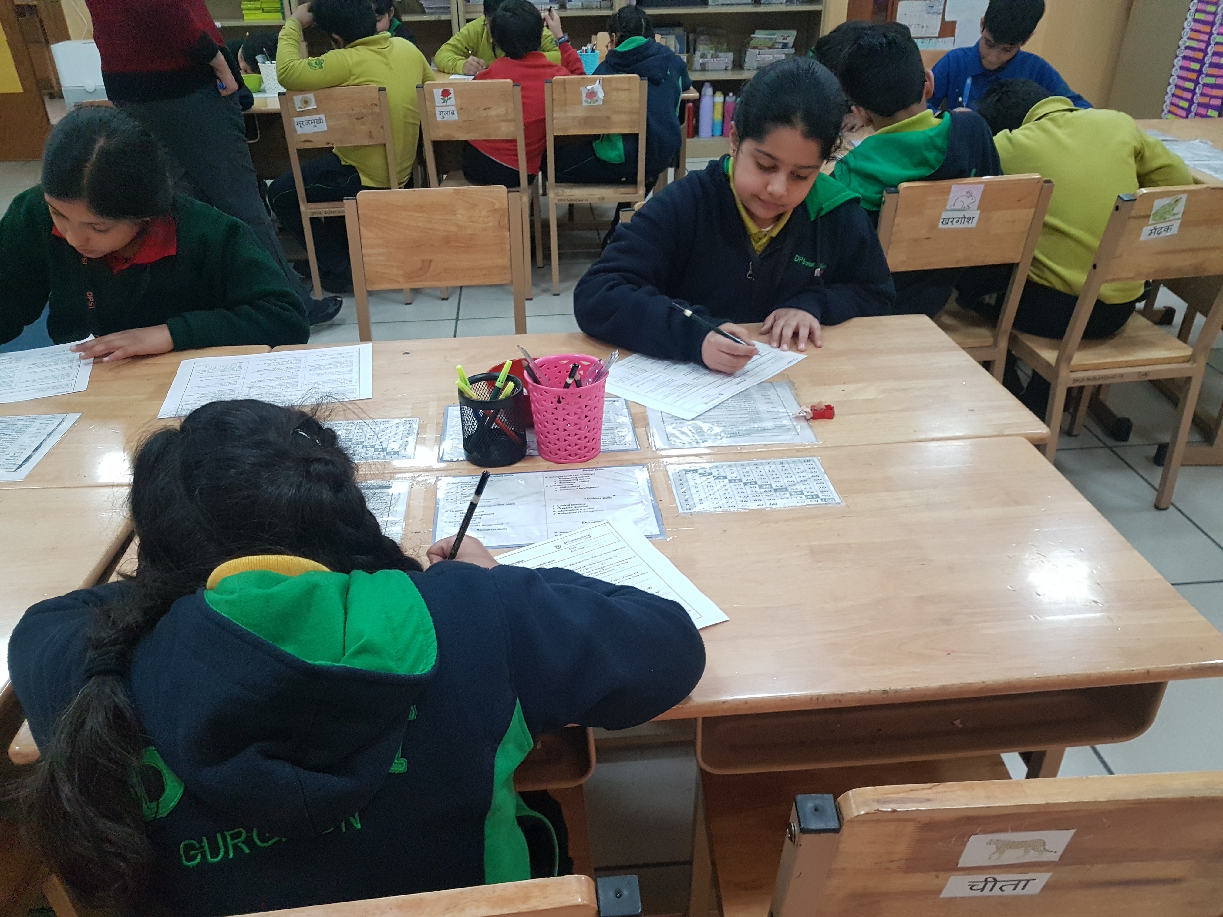 Students were eager to learn a technique used in day to day life known as skimming and scanning. They were made to read a news article and used their understanding to answer given questions from the same. They created sentences with ‘spell bee’ words and were also able to recognize the different parts of speech. Students were familiarized with the concept of novel study with the book ‘The Eyes of the Eagle’ by Ruskin Bond. Using De Bono’s Thinking Hats, the eager readers set out to discover various interesting facts about the book and acknowledged the skills that they had used during the activity. The cover page of the book was then analyzed and the students penned down what they surmised the story to be. ‘Fill in the blanks’ were given to the students for them to rearrange into correct spellings.