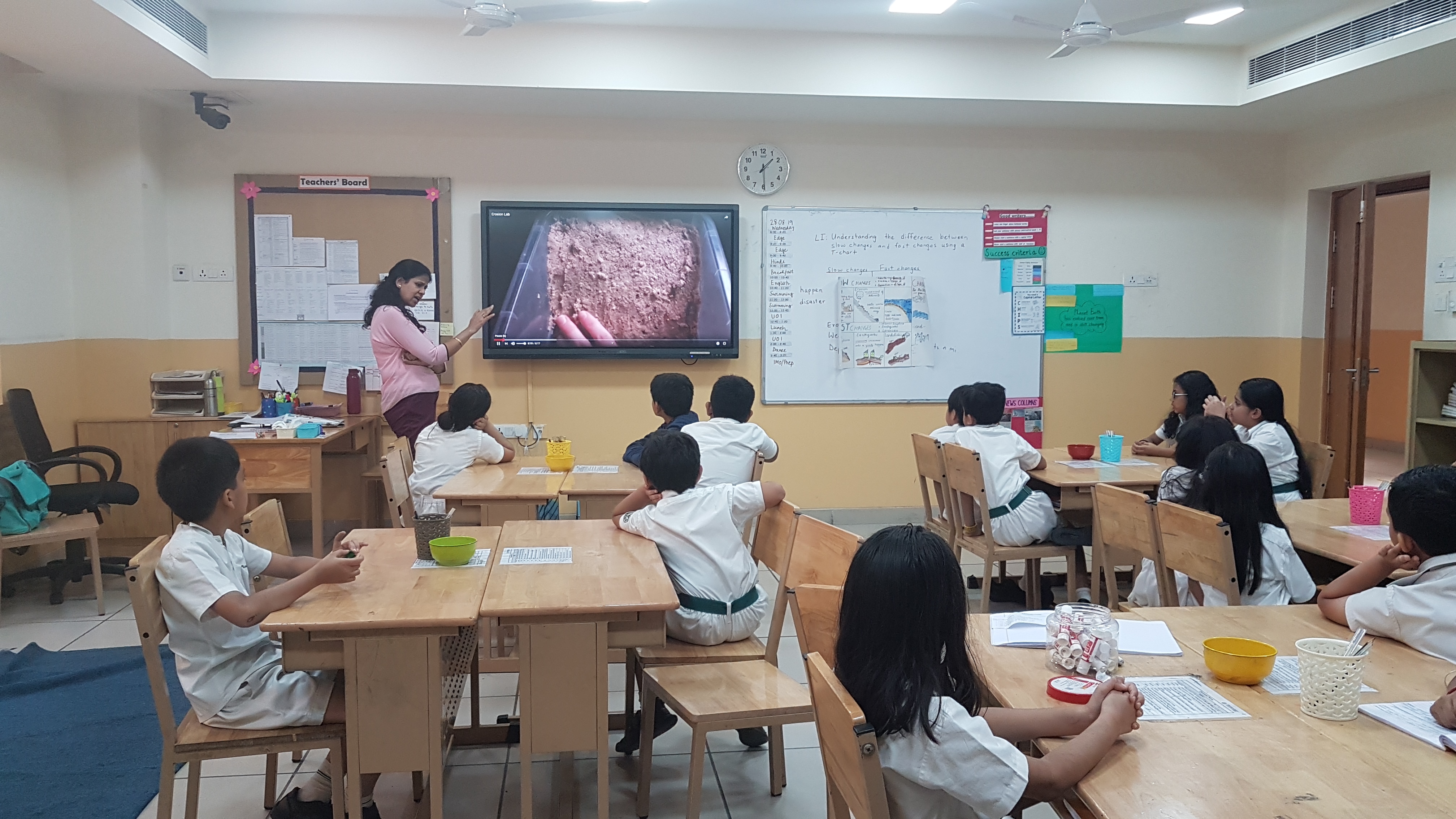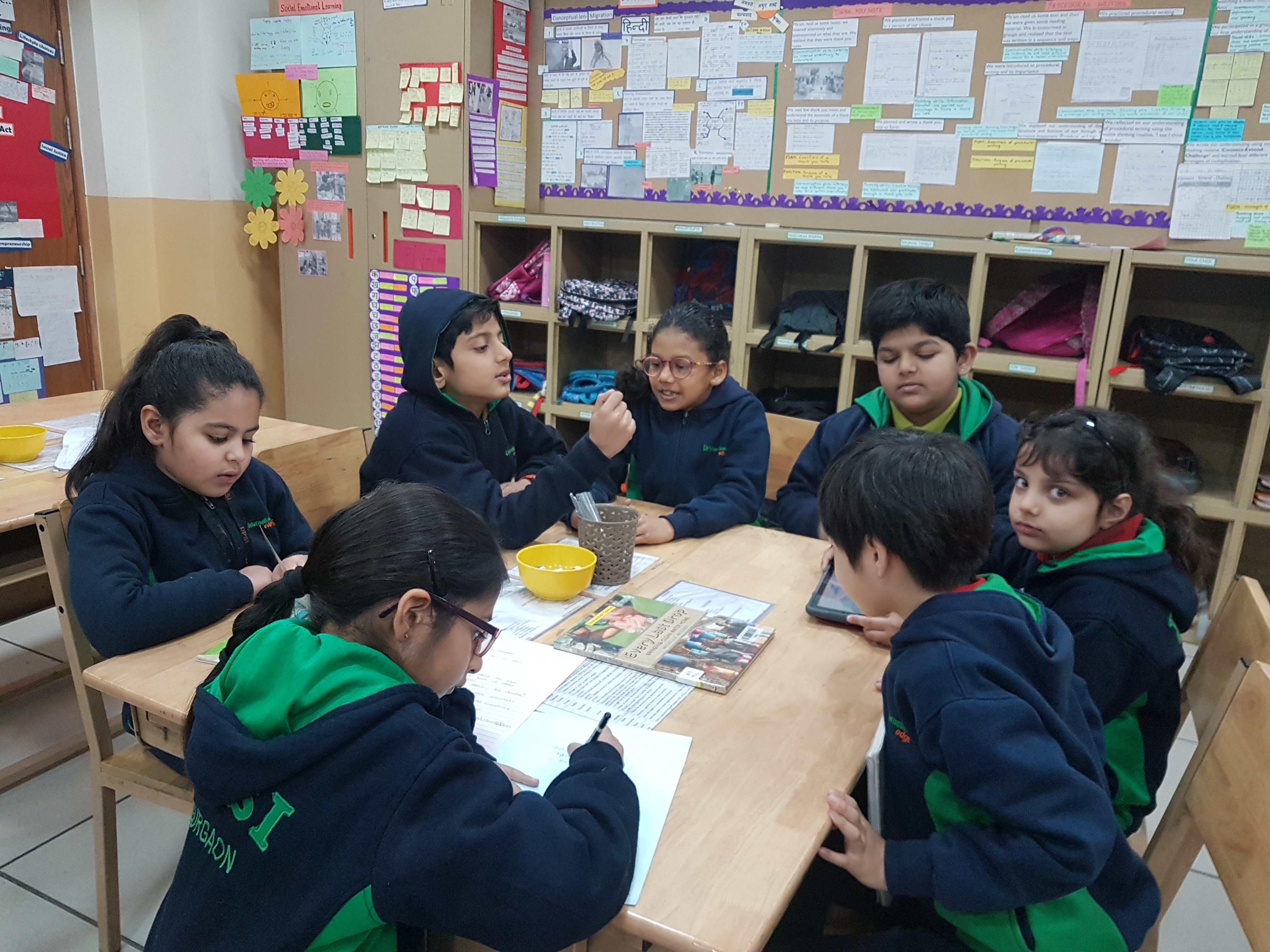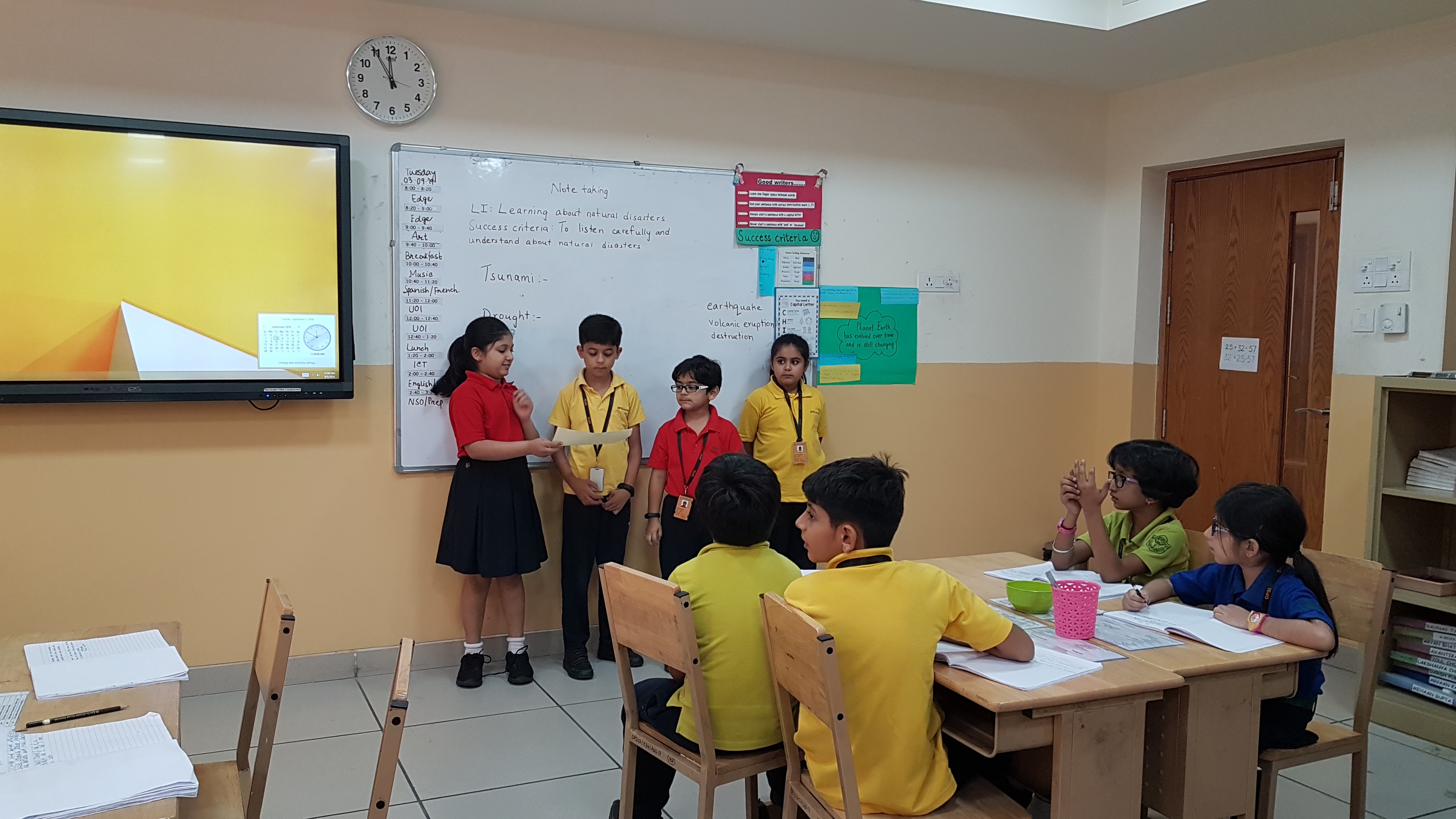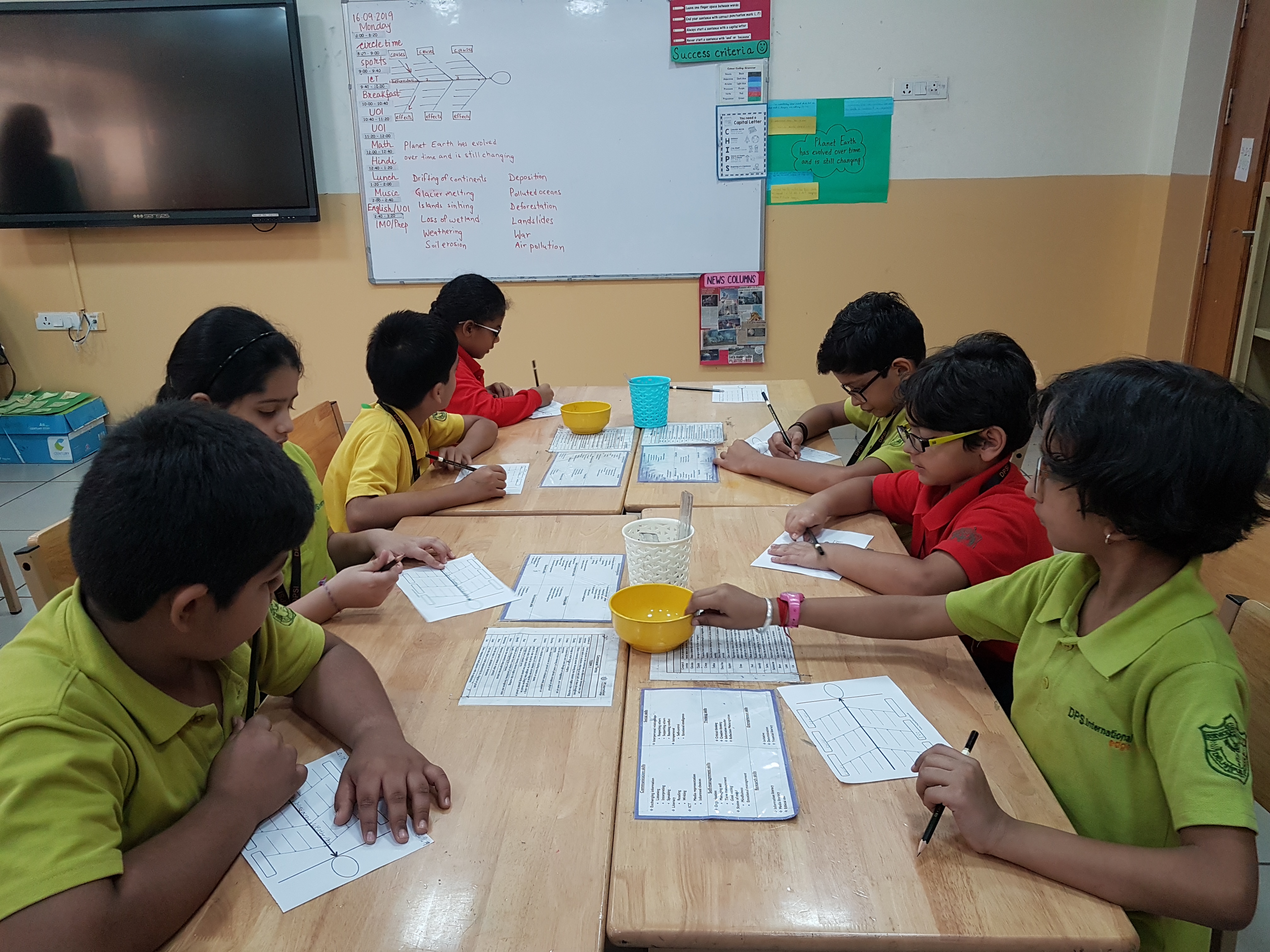 The week began with an interesting discussion on natural and manmade disasters. By employing the ‘double bubble’ map and T-chart, students compared the two and explored different ways on how humans are responsible for global warming. A discussion with Ms. Sutanuka Bhattacharjee on the recent fires in the Amazon was an initiative in this direction. The class deliberated on the session by applying a visible thinking strategy ‘connect extend challenge’ and keenly observed different experiments on soil erosion, weathering, deposition and loss of wetlands. They then demonstrated their understanding of the topic using the ICT tool ‘Flip grid’ and summed up their learning by using the fishbone strategy.