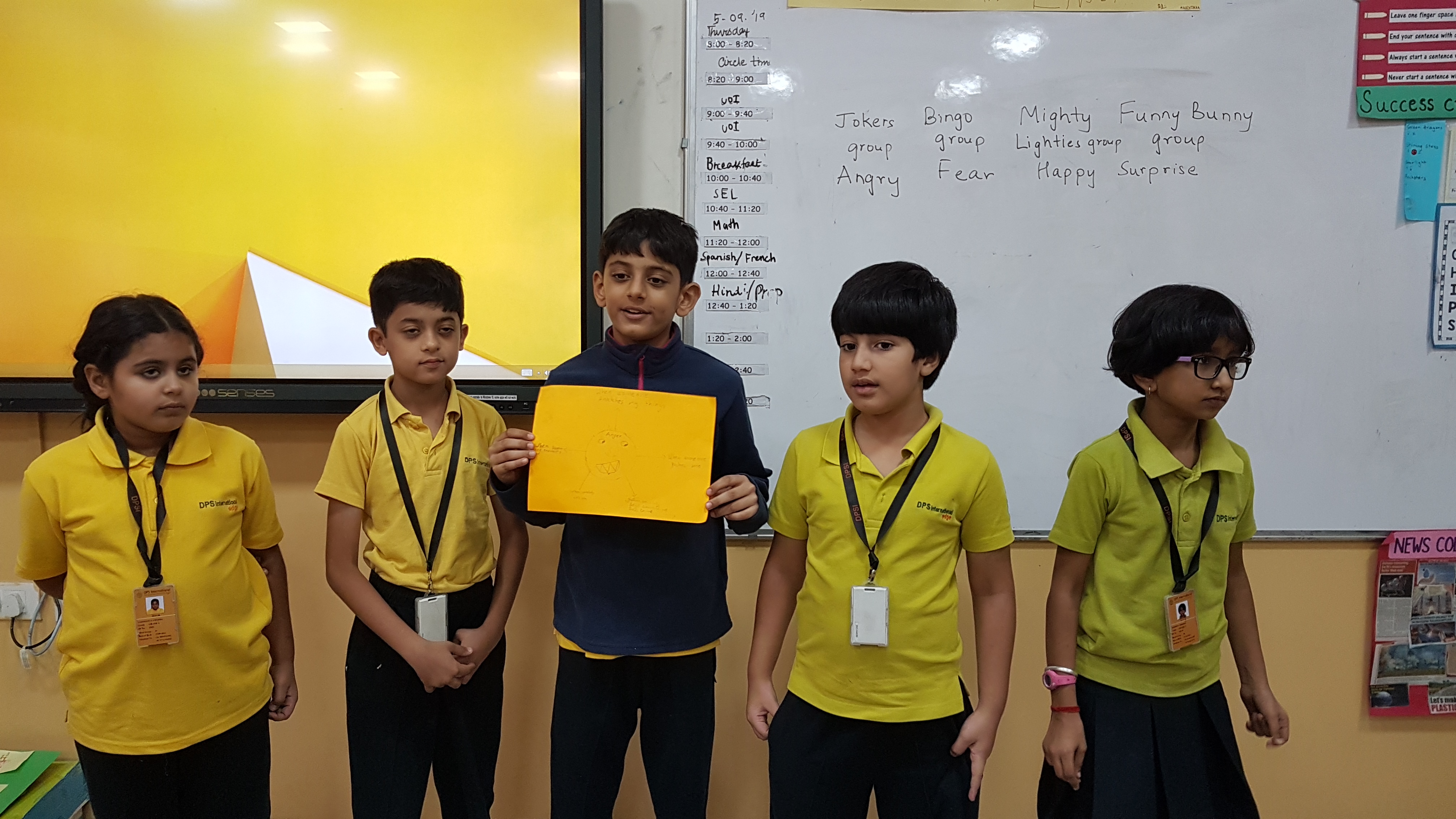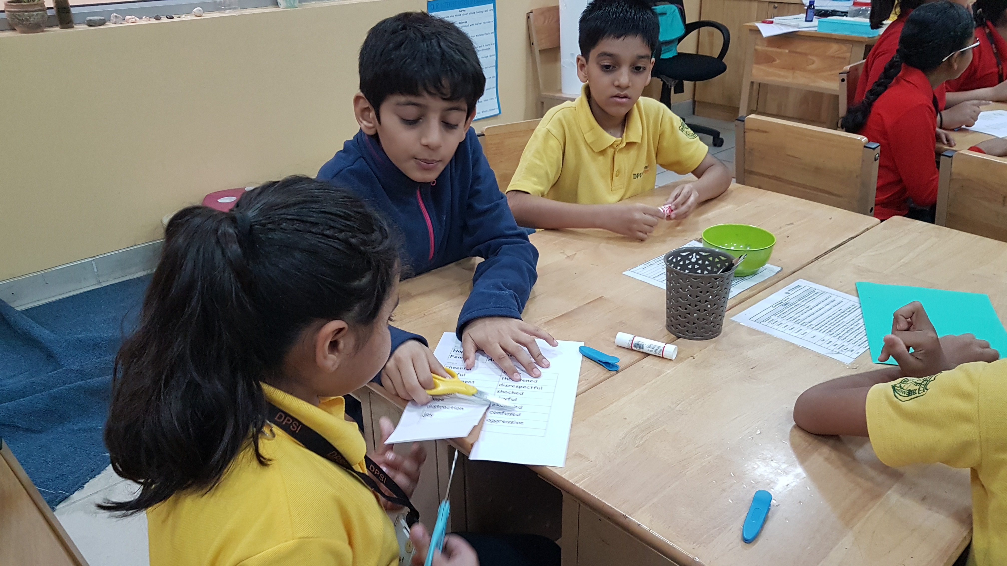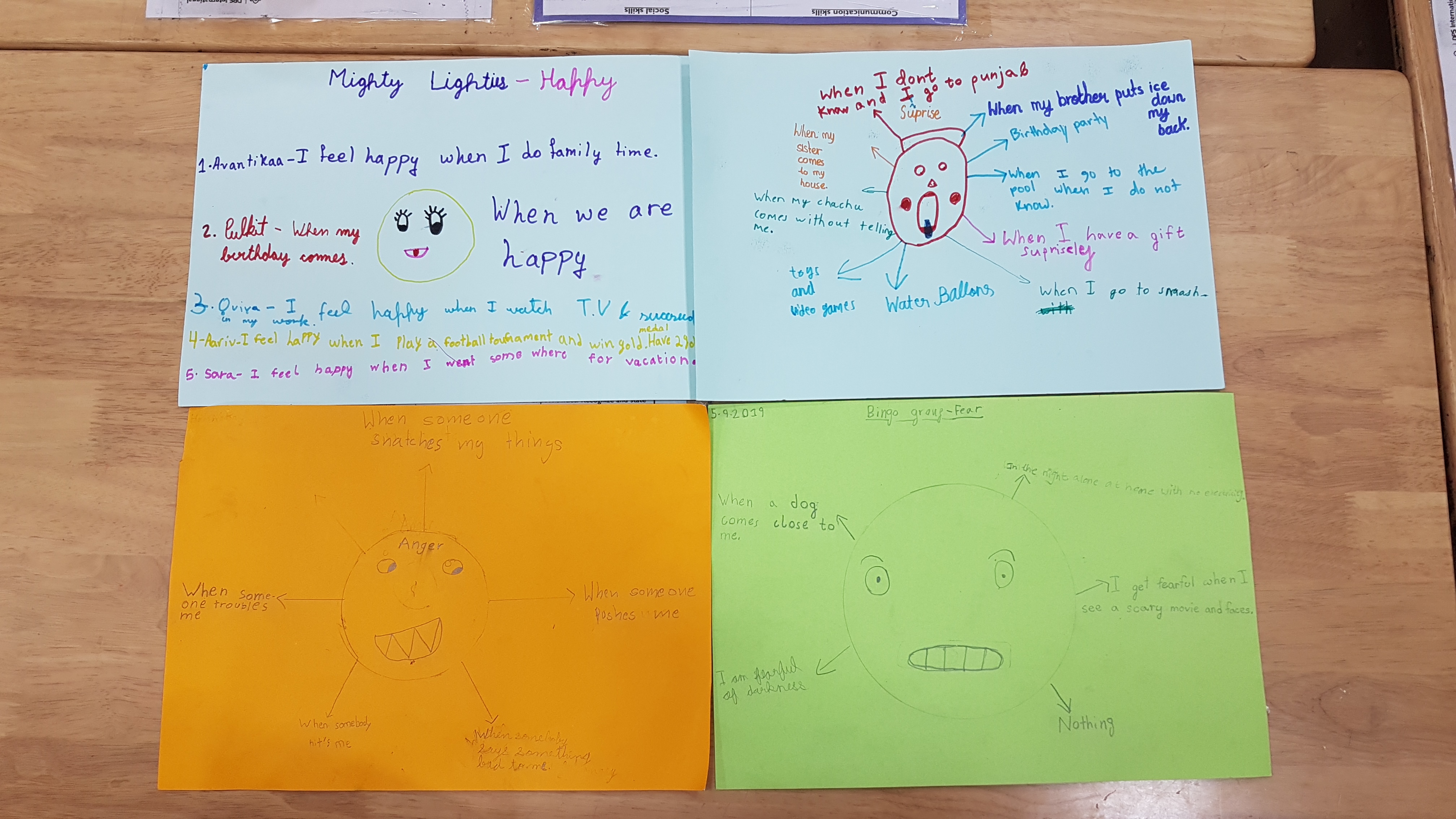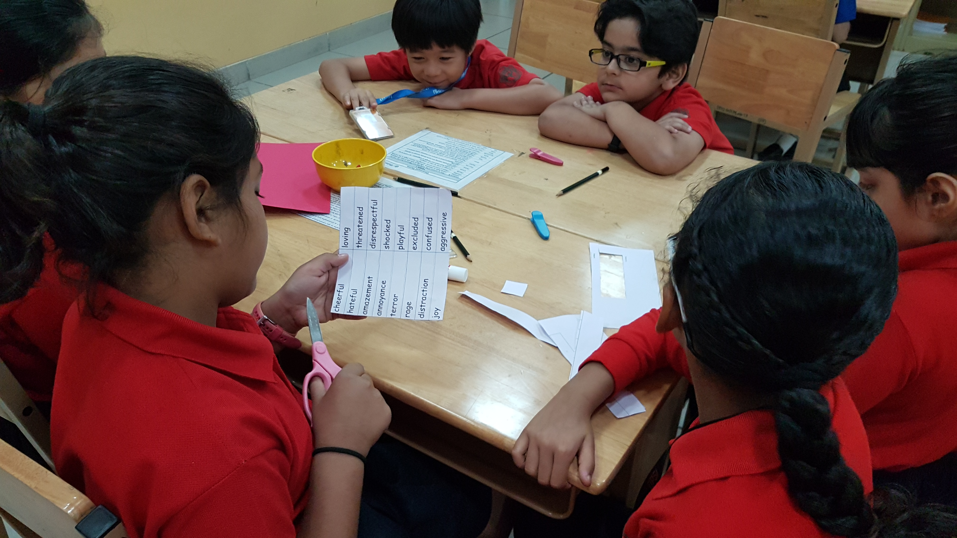 This week’s Social and Emotional Learning class focused on enabling children to identify their own feelings and emotions and use them appropriately in everyday situations. Students were given two lists – one containing feelings and the other emotions. They were then asked to read out the feelings from one list and then cut out and paste them under the corresponding emotion section. After the activity an animated discussion was held on how and when to identify these emotions.