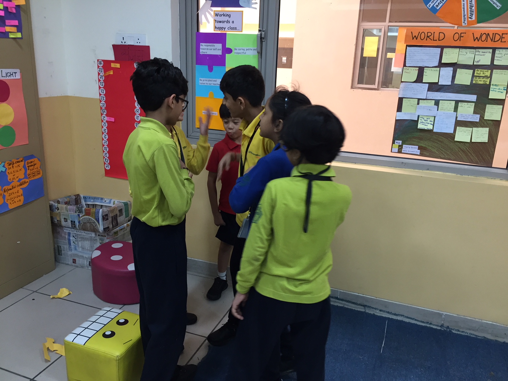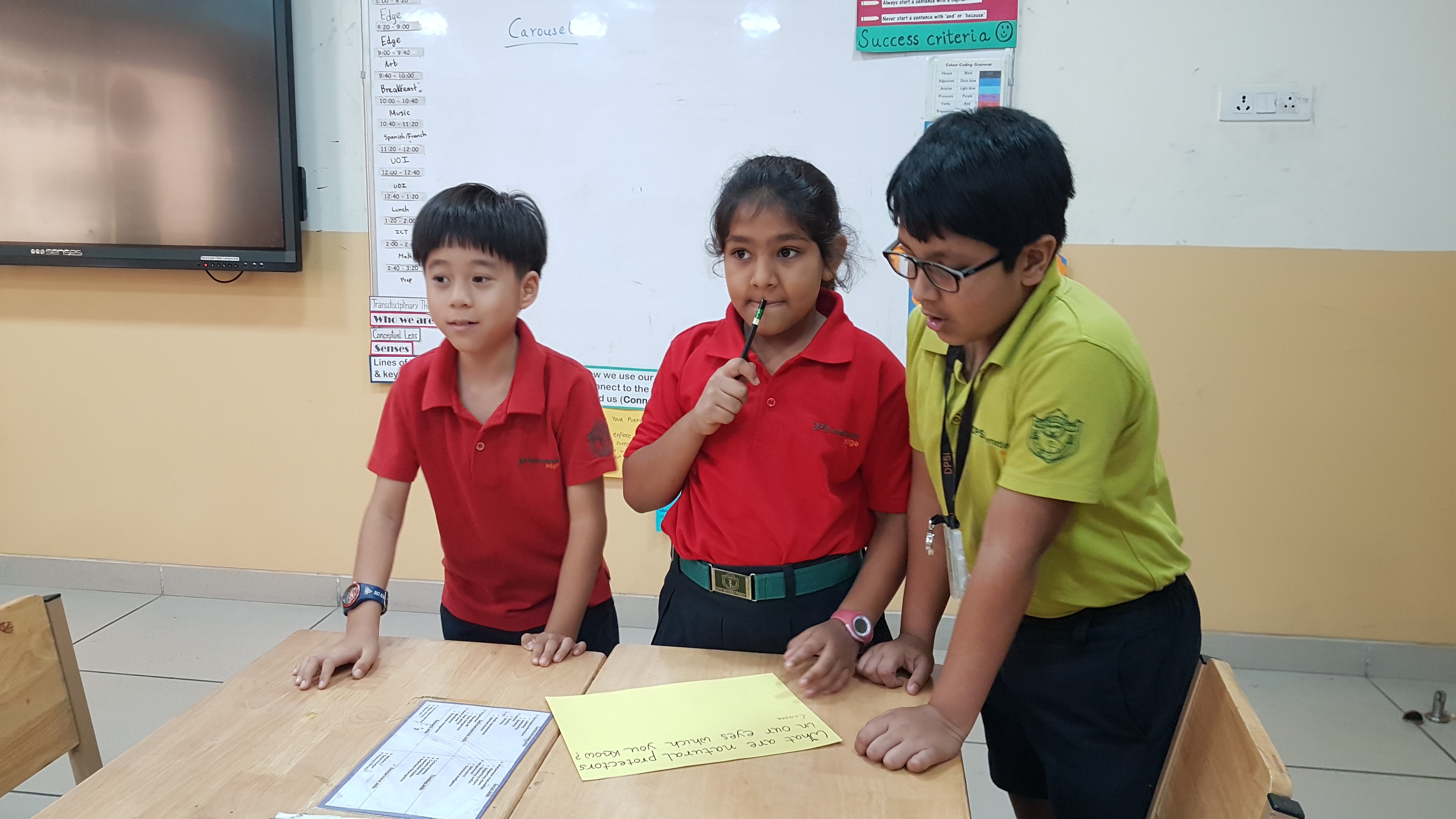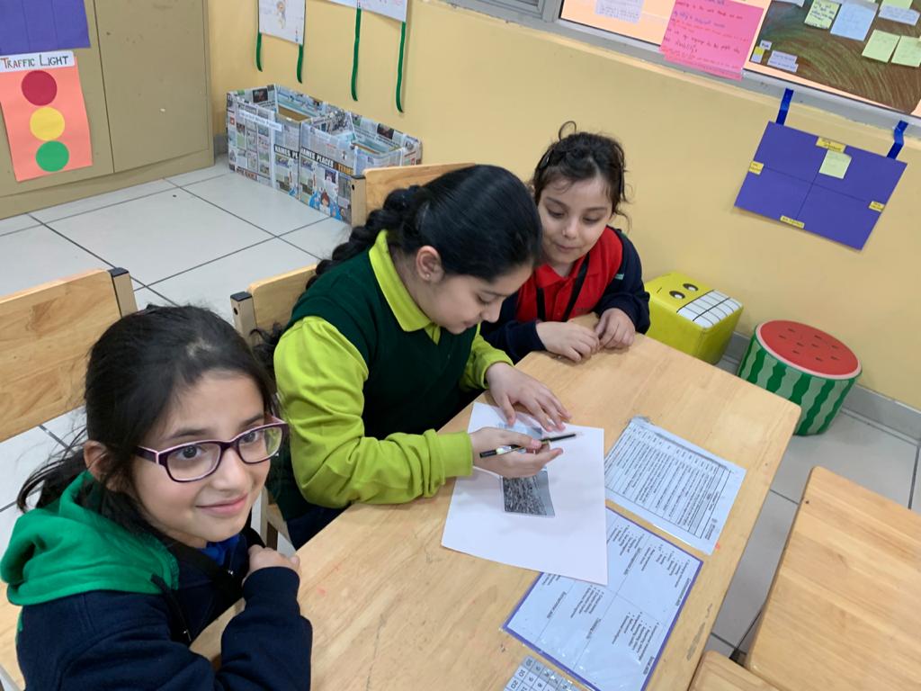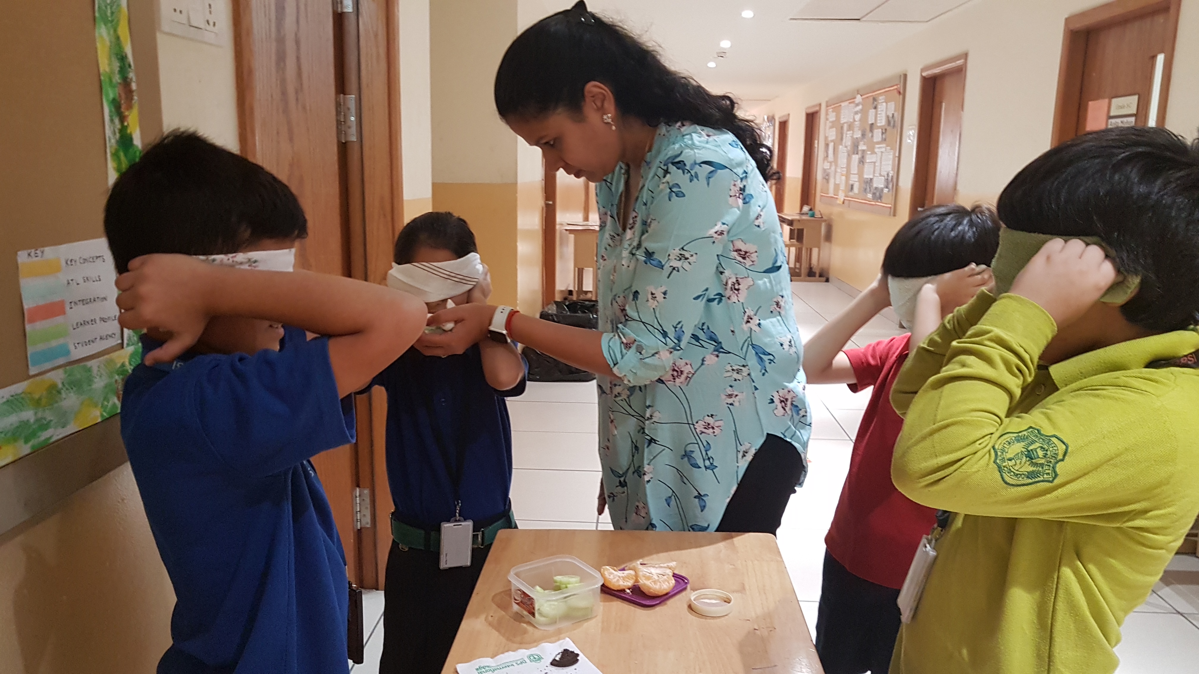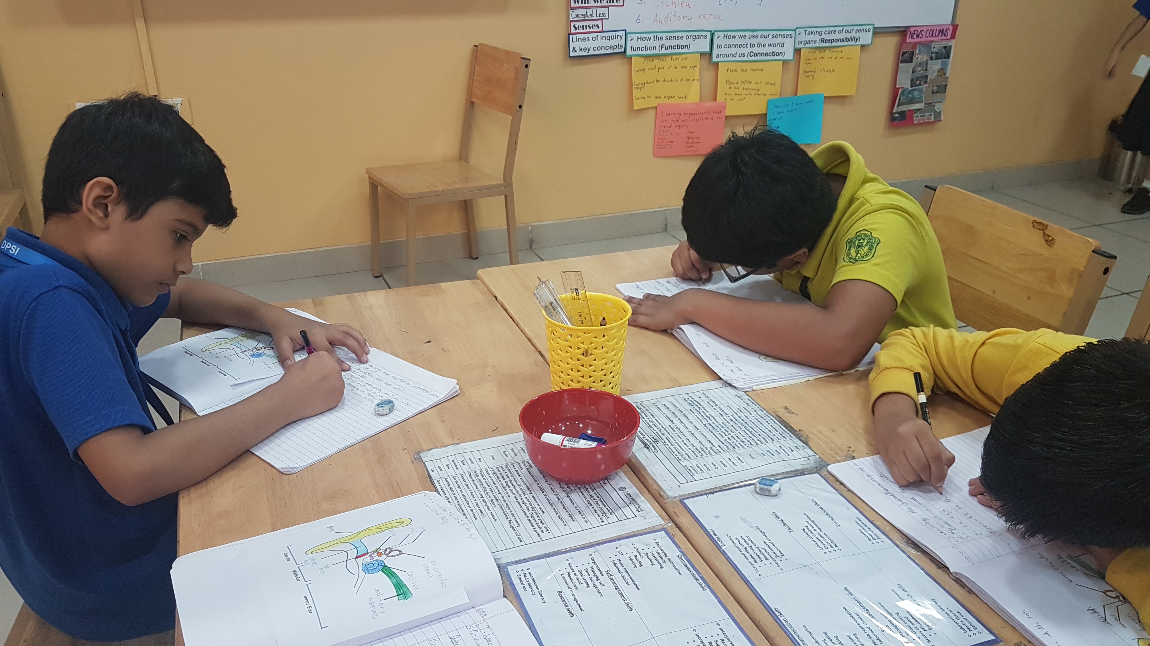 The students then geared up for the provocation of the new unit by using the ‘I see I think I wonder’ visual thinking routine by exploring different stations with items related to senses. They used their thinking skills to write what they thought about the new unit and exchanged information to identify key words to understand the central idea.