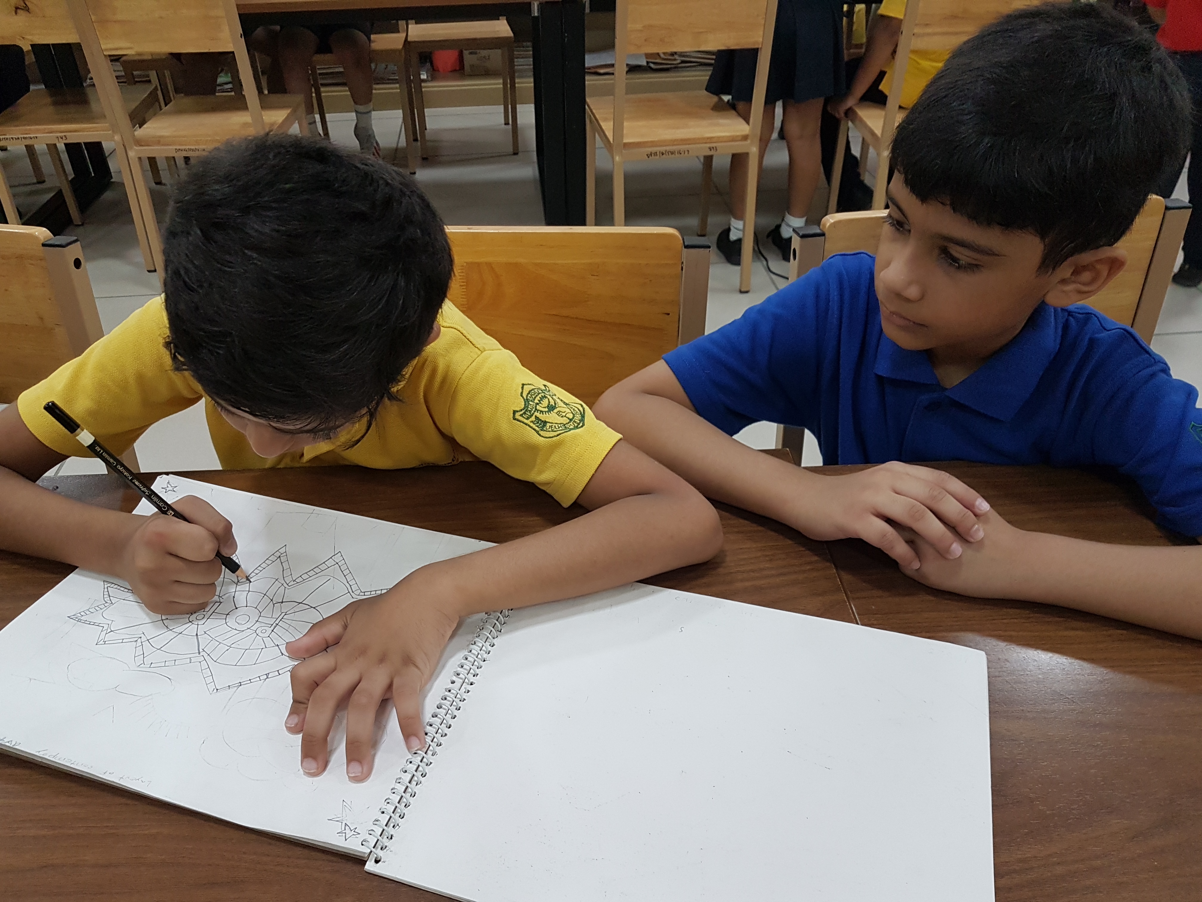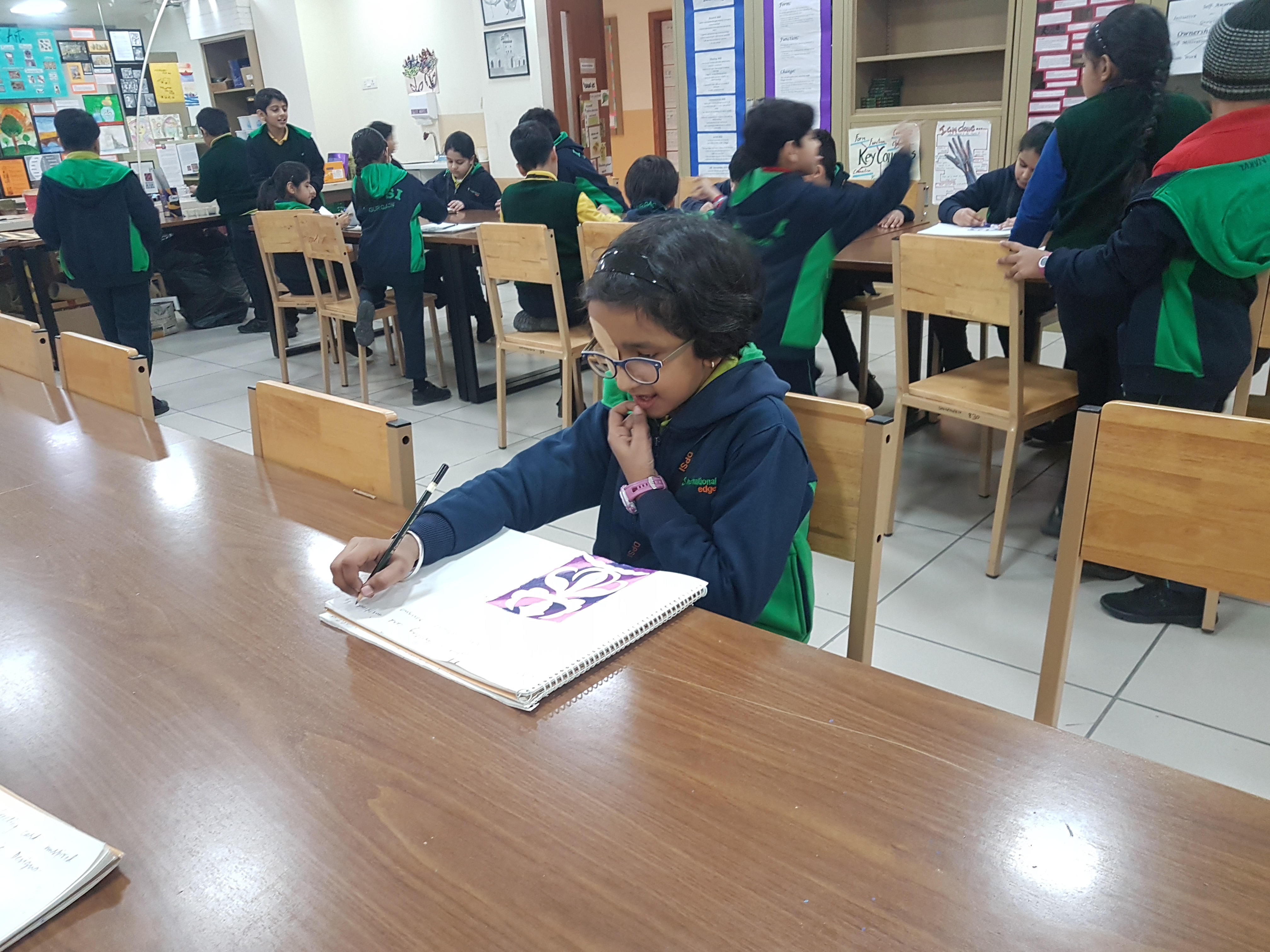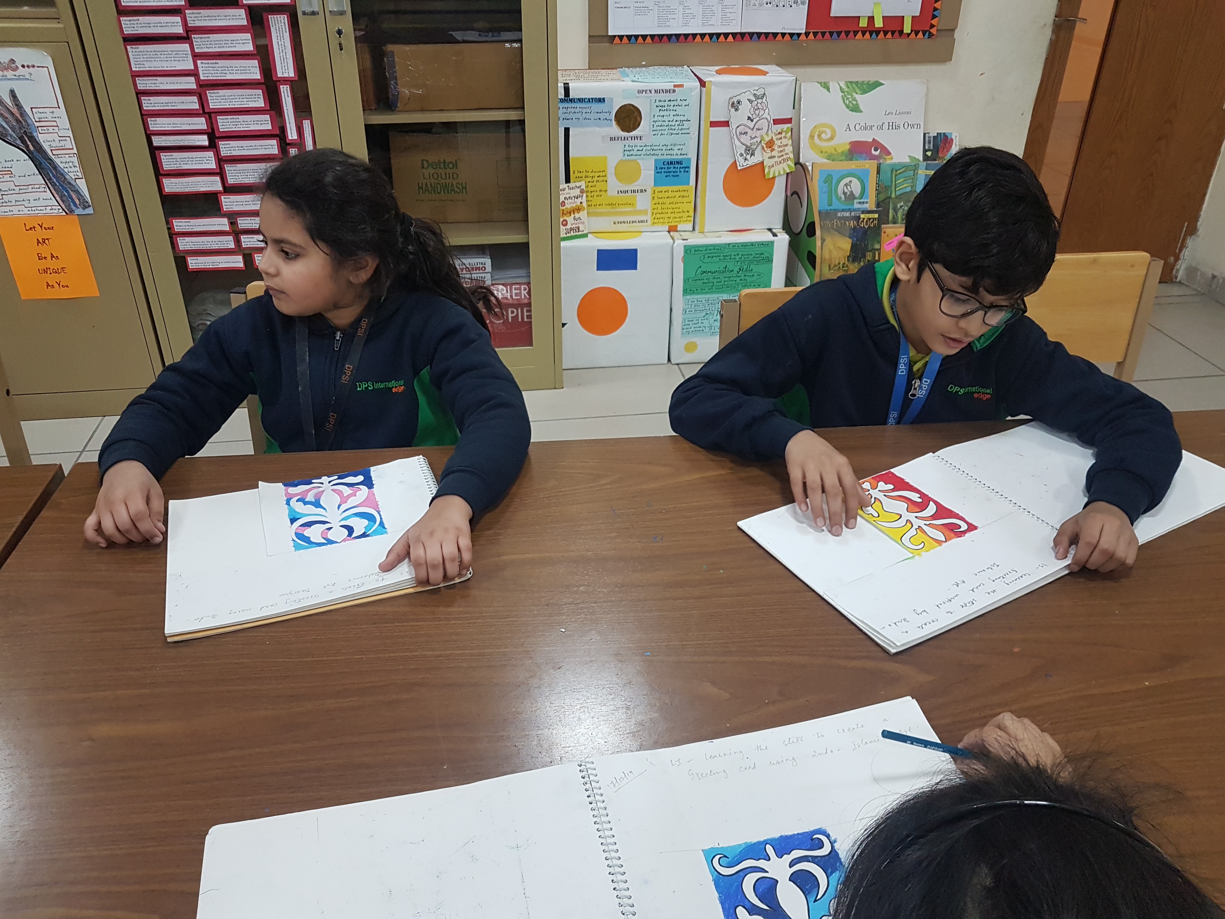 Students inquired into positive and negative space and learnt to balance the two. Keeping this in mind they created a balanced work on Indo Islamic art using shades of one colour family (monochrome) to colour the background of their artwork.