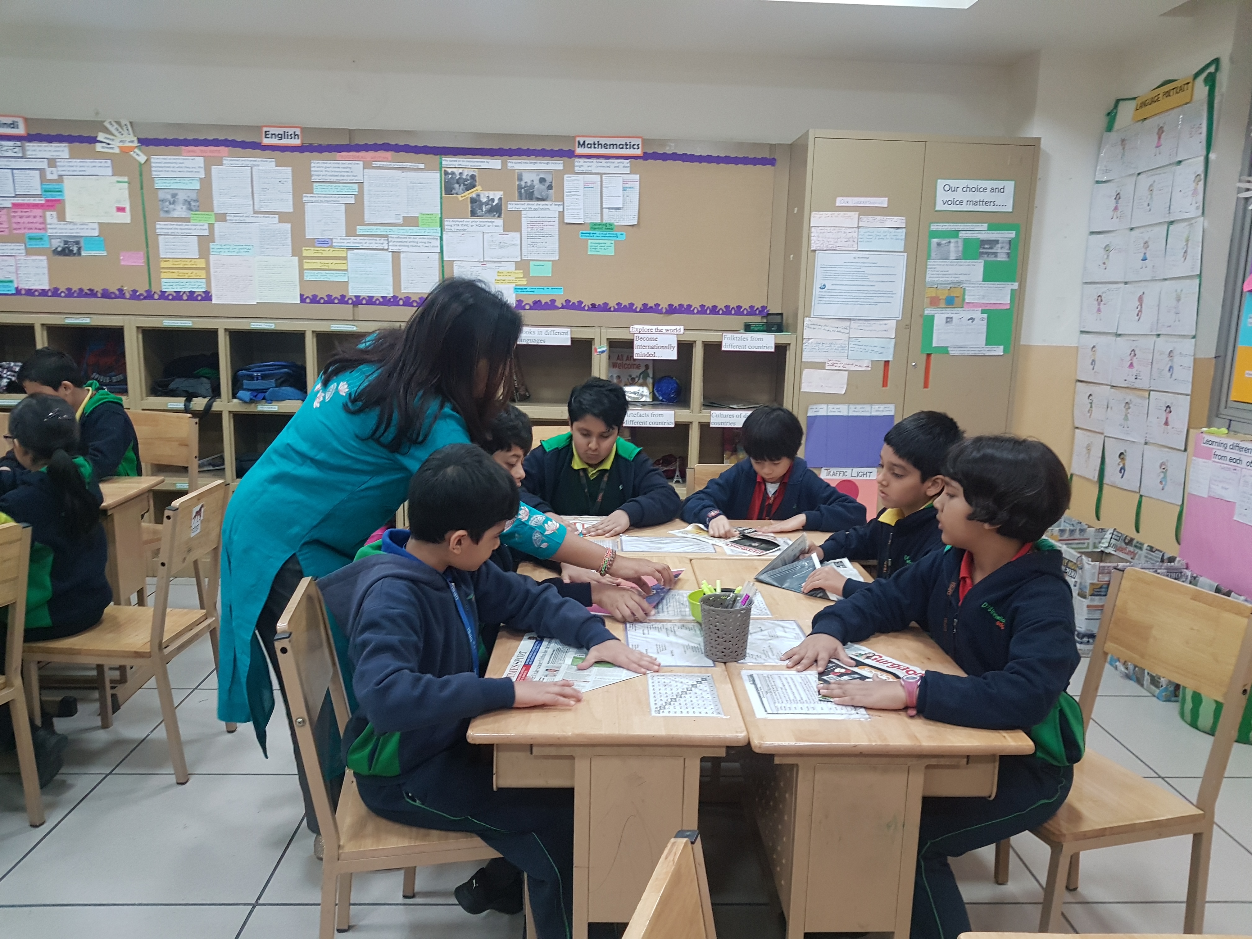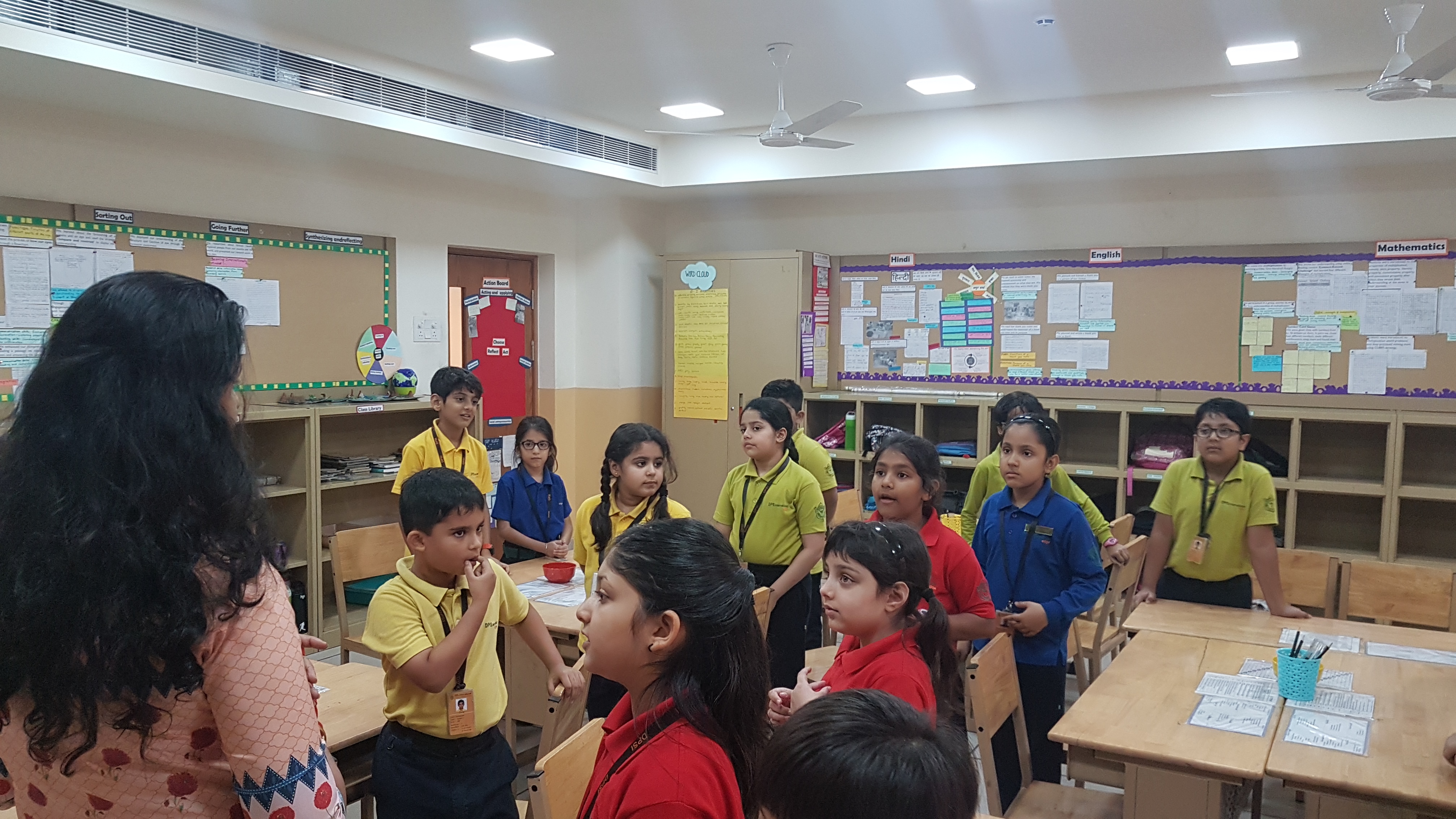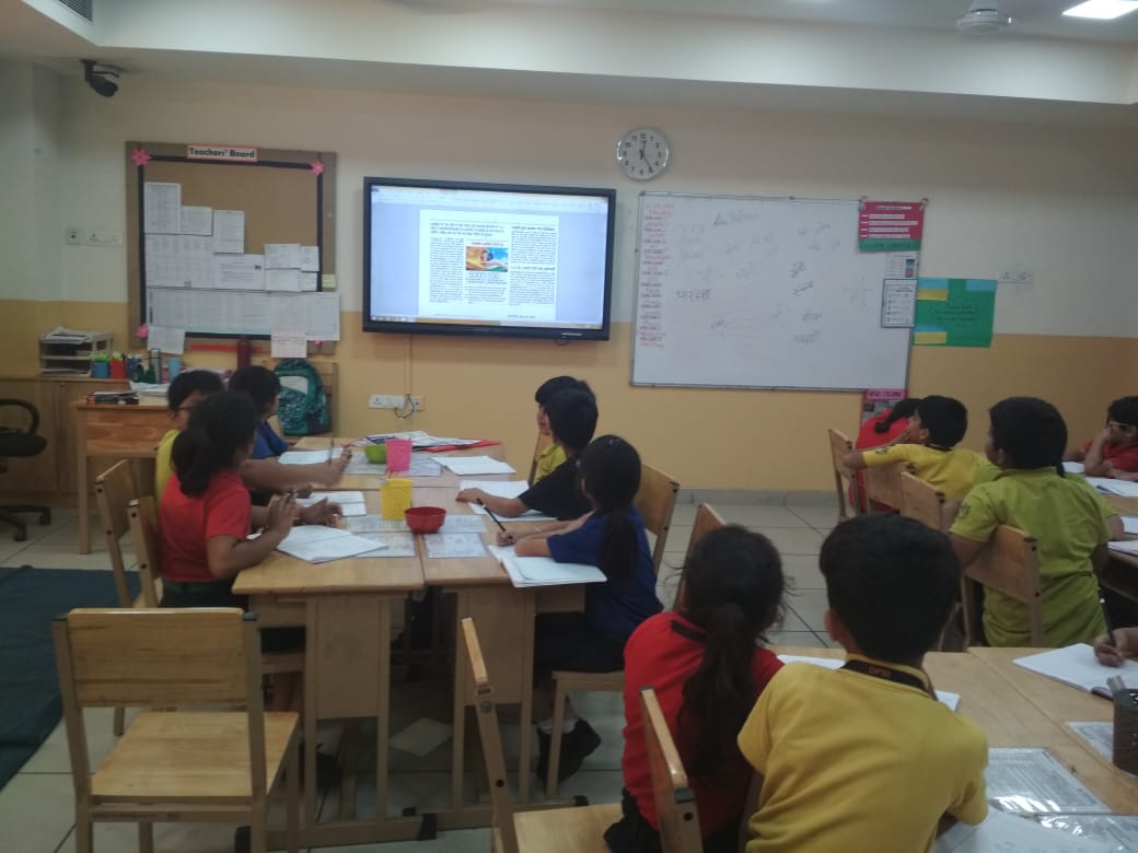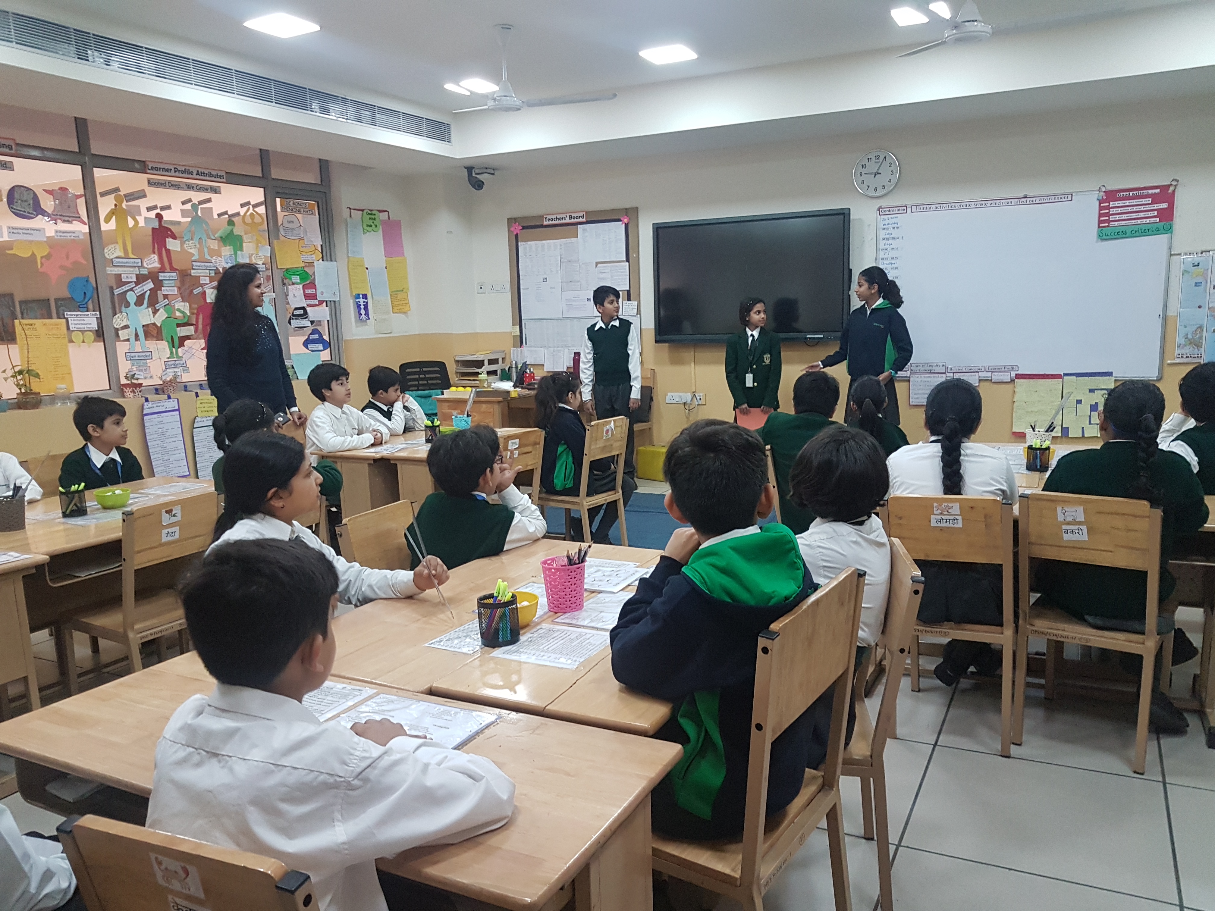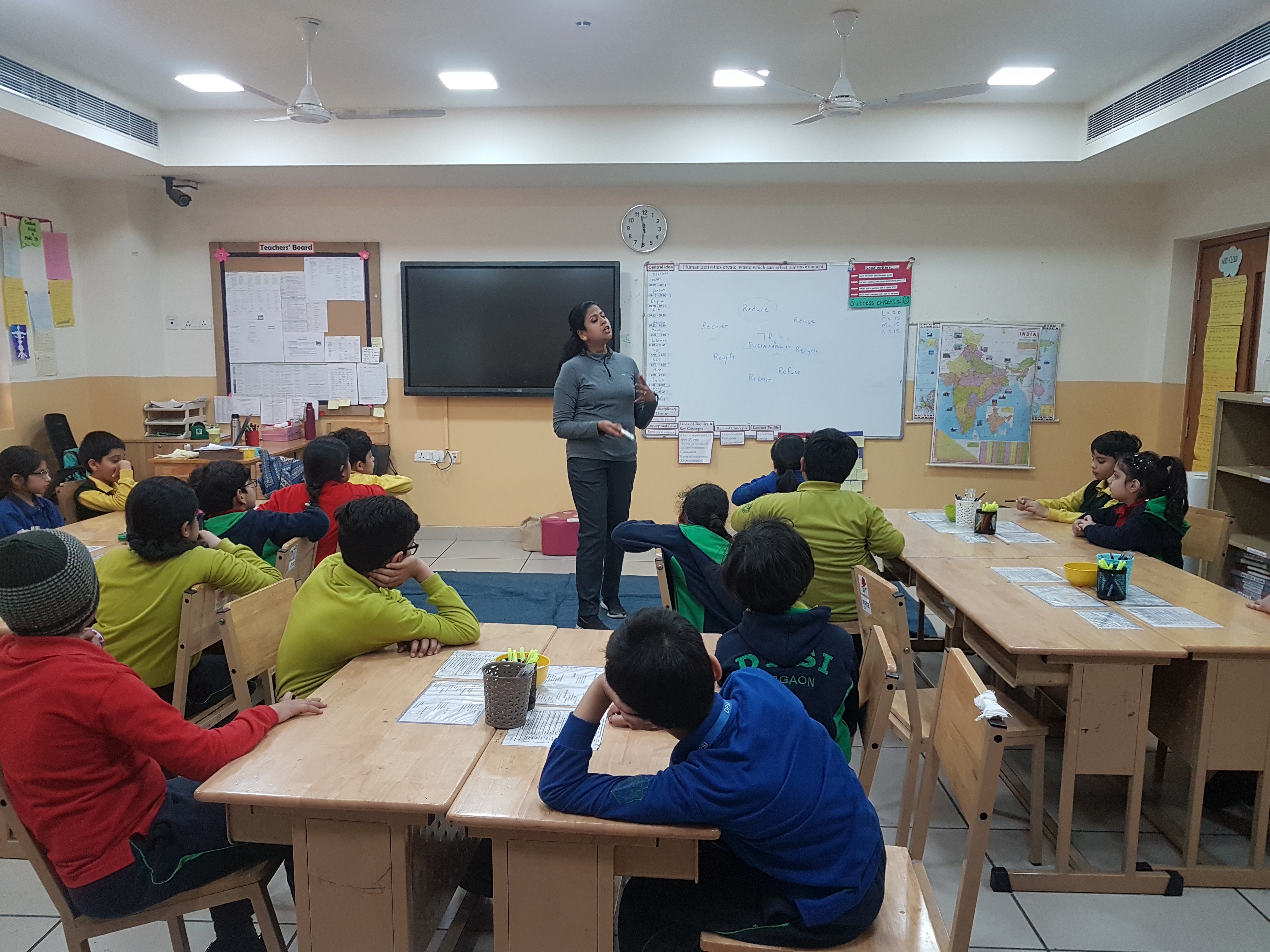Students worked on their creative thinking where they learned to identify valuable statements from the article/story read to them while backing it with evidence. They honed their understanding of spell-bee words through a peer assessment activity. In tandem with their UOI waste management lesson, they learned co-construction of rubric and paragraph writing. For a similar unit integration lesson, they created “valuable statement” while reading the waste management article with the underlying thought “‘Waste for one person is necessity for another person”. There was a group activity where each batch was provided with 2-3 scenarios related to waste/3 R’s. Students analysed and discussed each scenario within their groups. The summative assessment for articles and pronouns as well as spelling was taken.