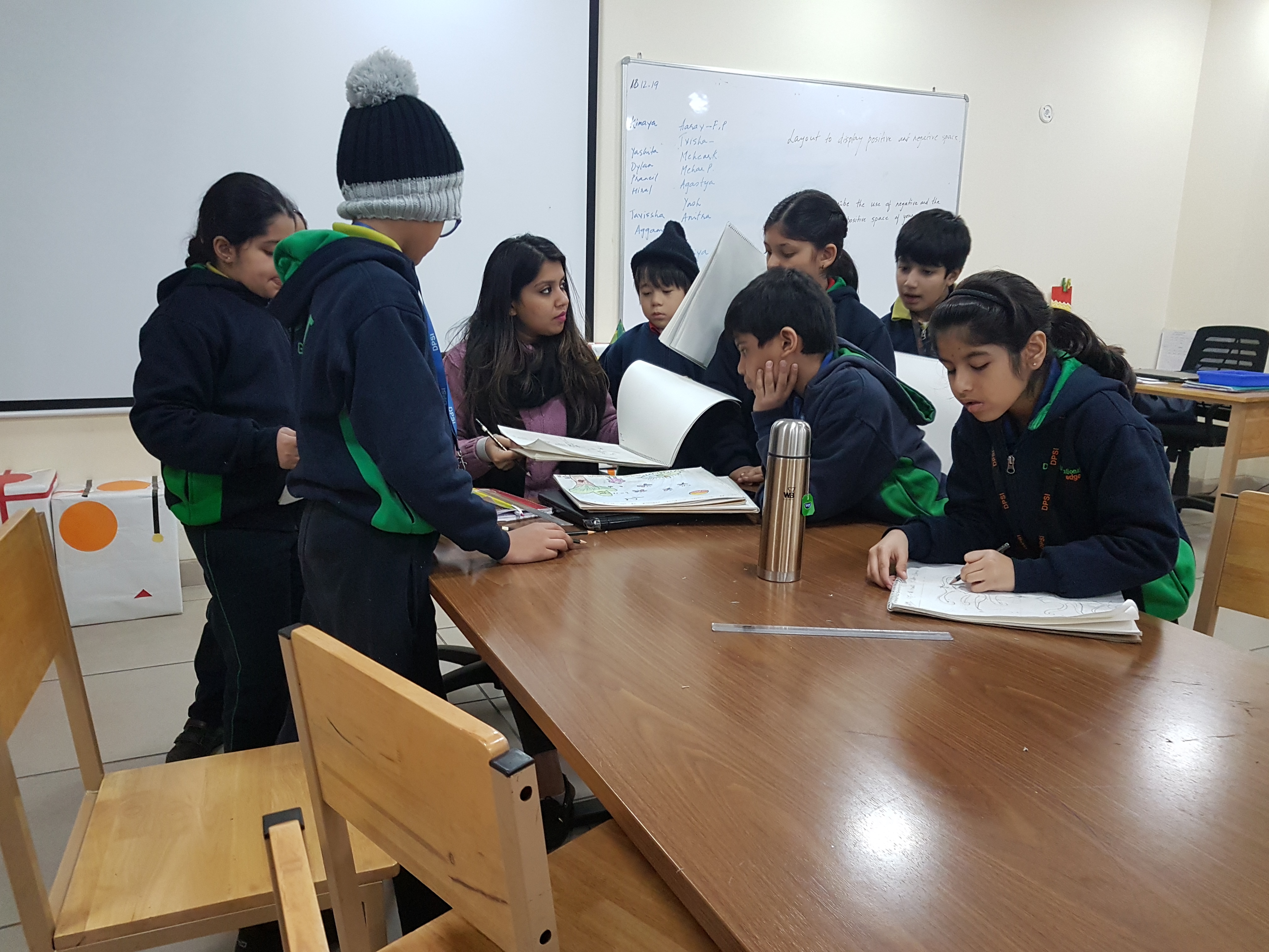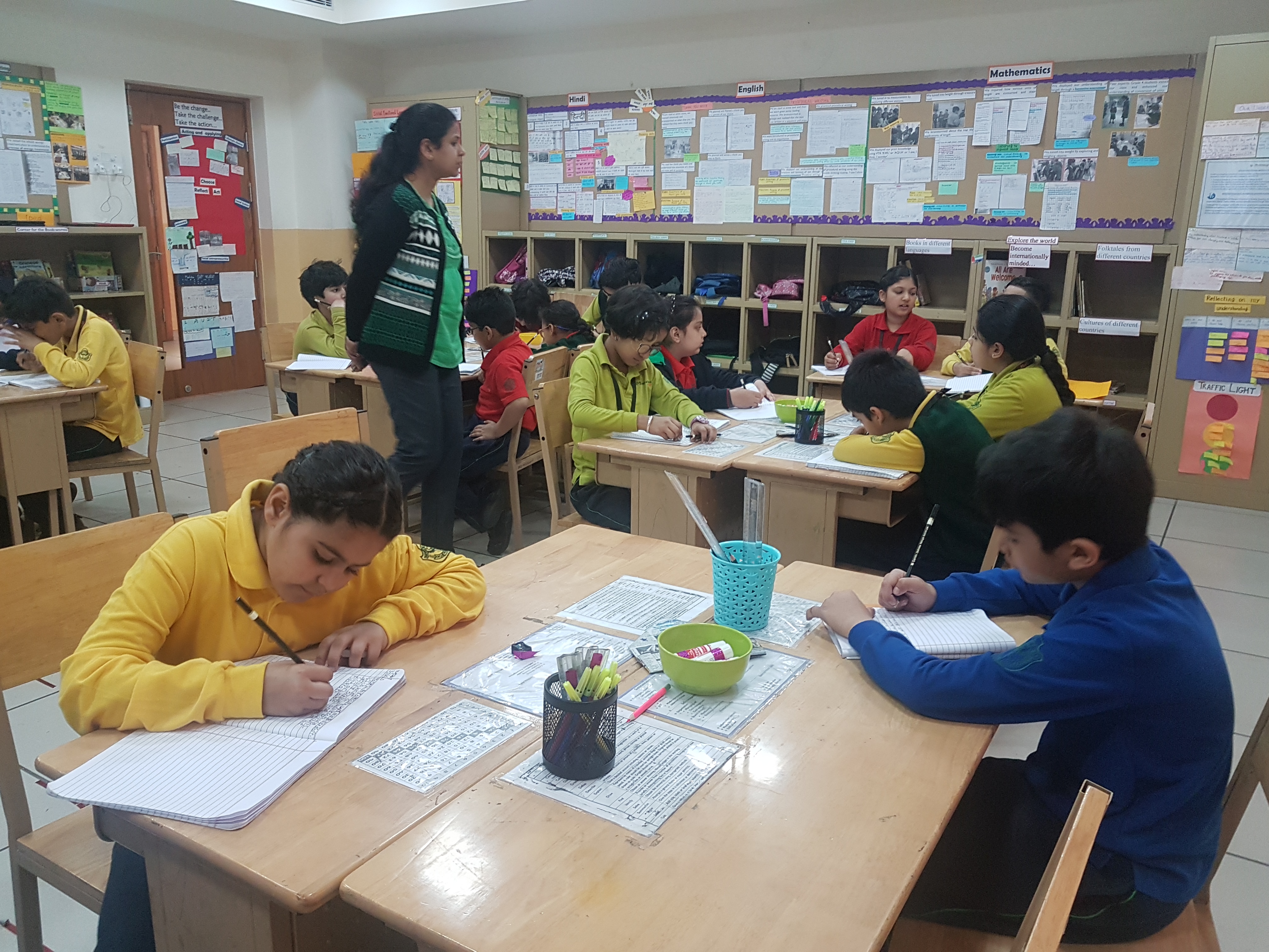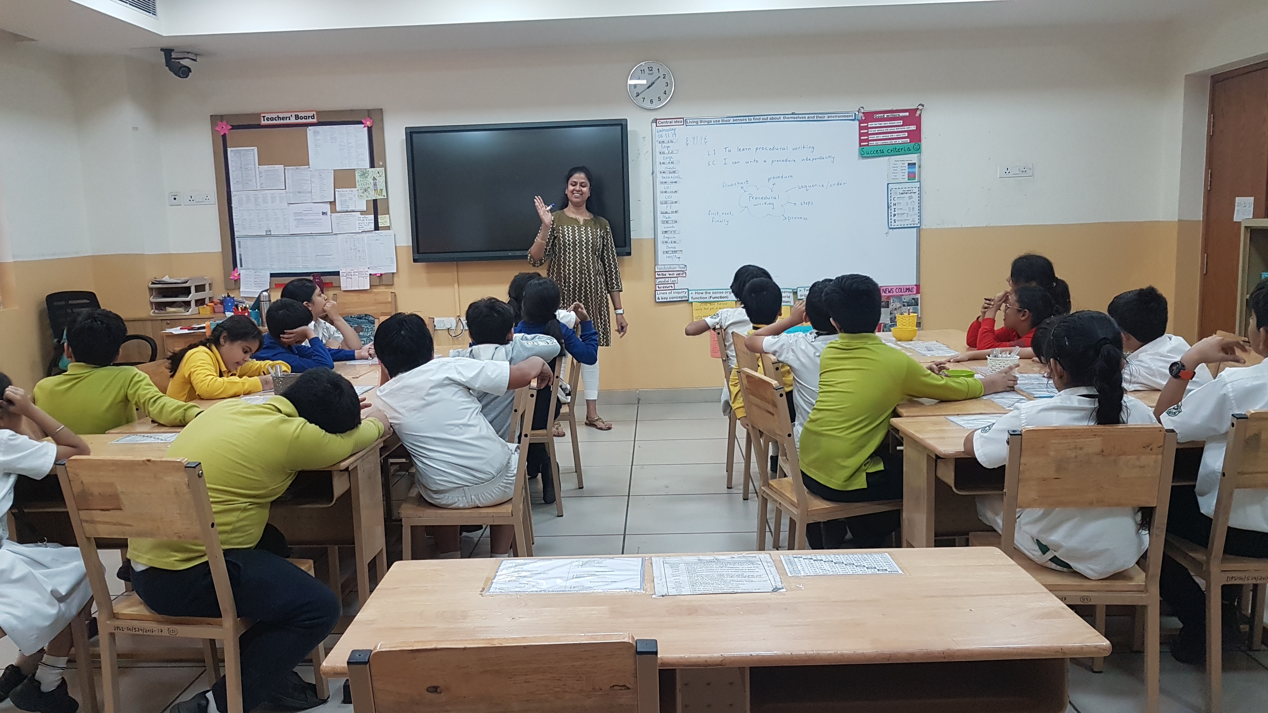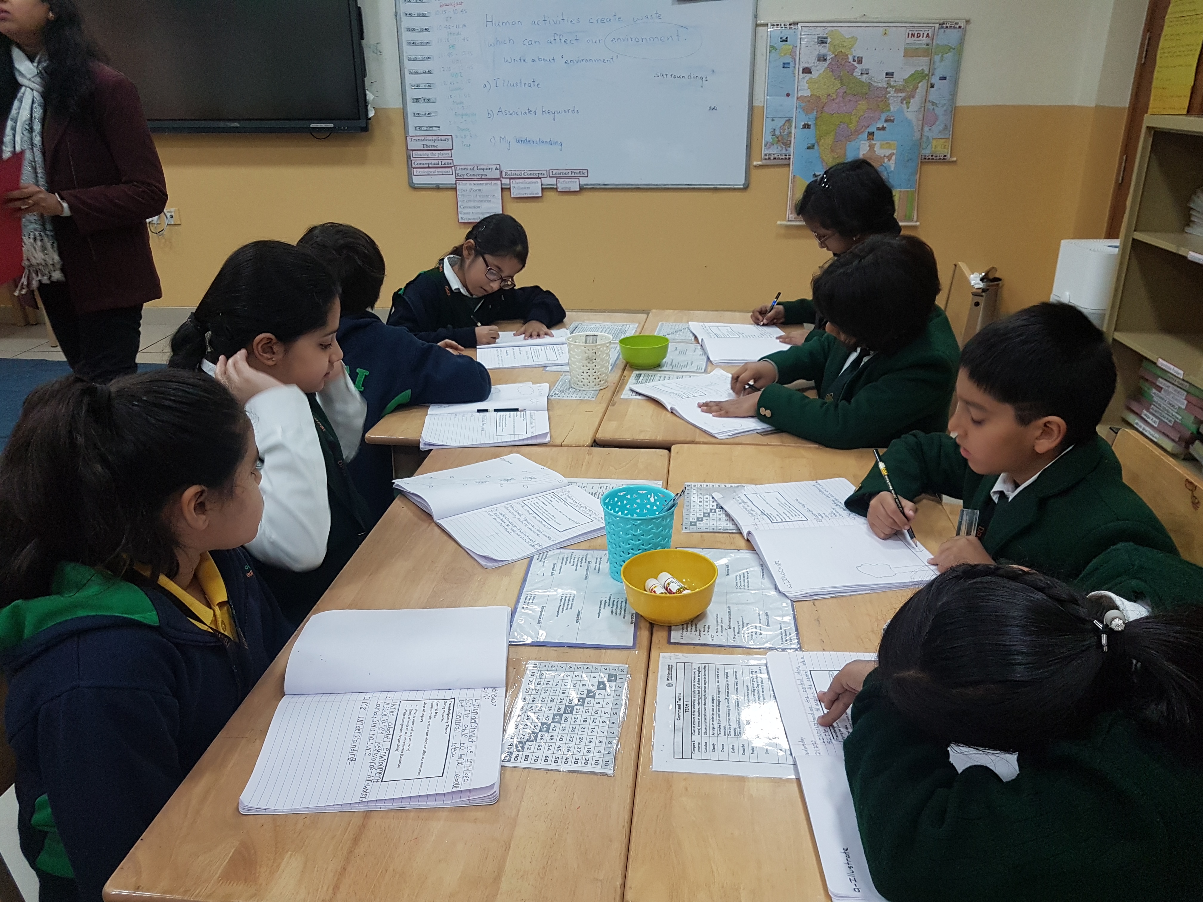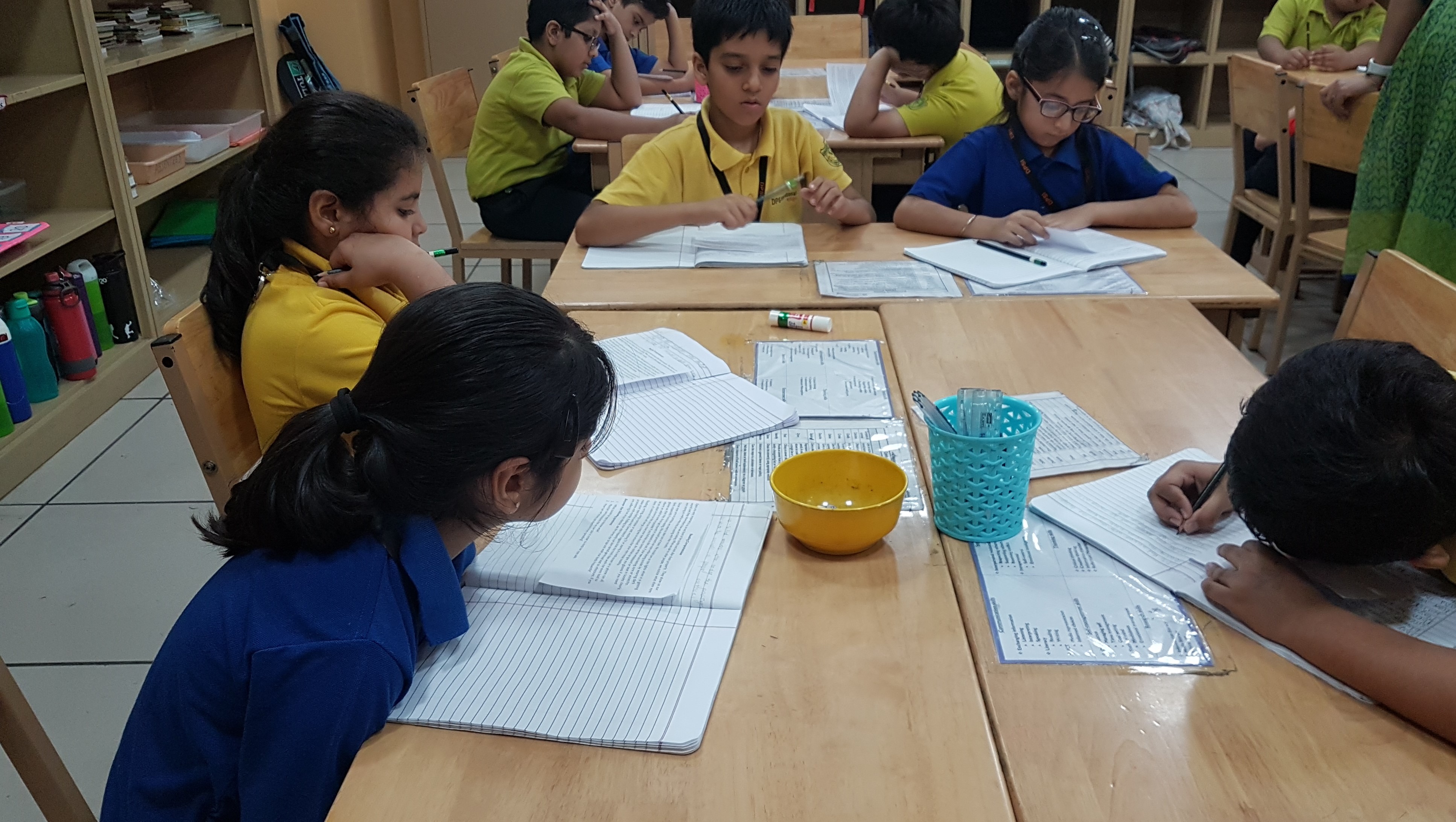Students worked on their creative thinking where they learned to identify valuable statements from the article/story read to them while backing it with evidence. They honed their understanding of spell-bee words through a peer assessment activity. In tandem with their UOI waste management lesson, they learned co-construction of rubric and paragraph writing. For a similar unit integration lesson, they created “valuable statement” while reading the waste management article with the underlying thought “‘Waste for one person is necessity for another person”. There was a group activity where each batch was provided with 2-3 scenarios related to waste/3 R’s. Students analysed and discussed each scenario within their groups. The summative assessment for articles and pronouns as well as spelling was taken.