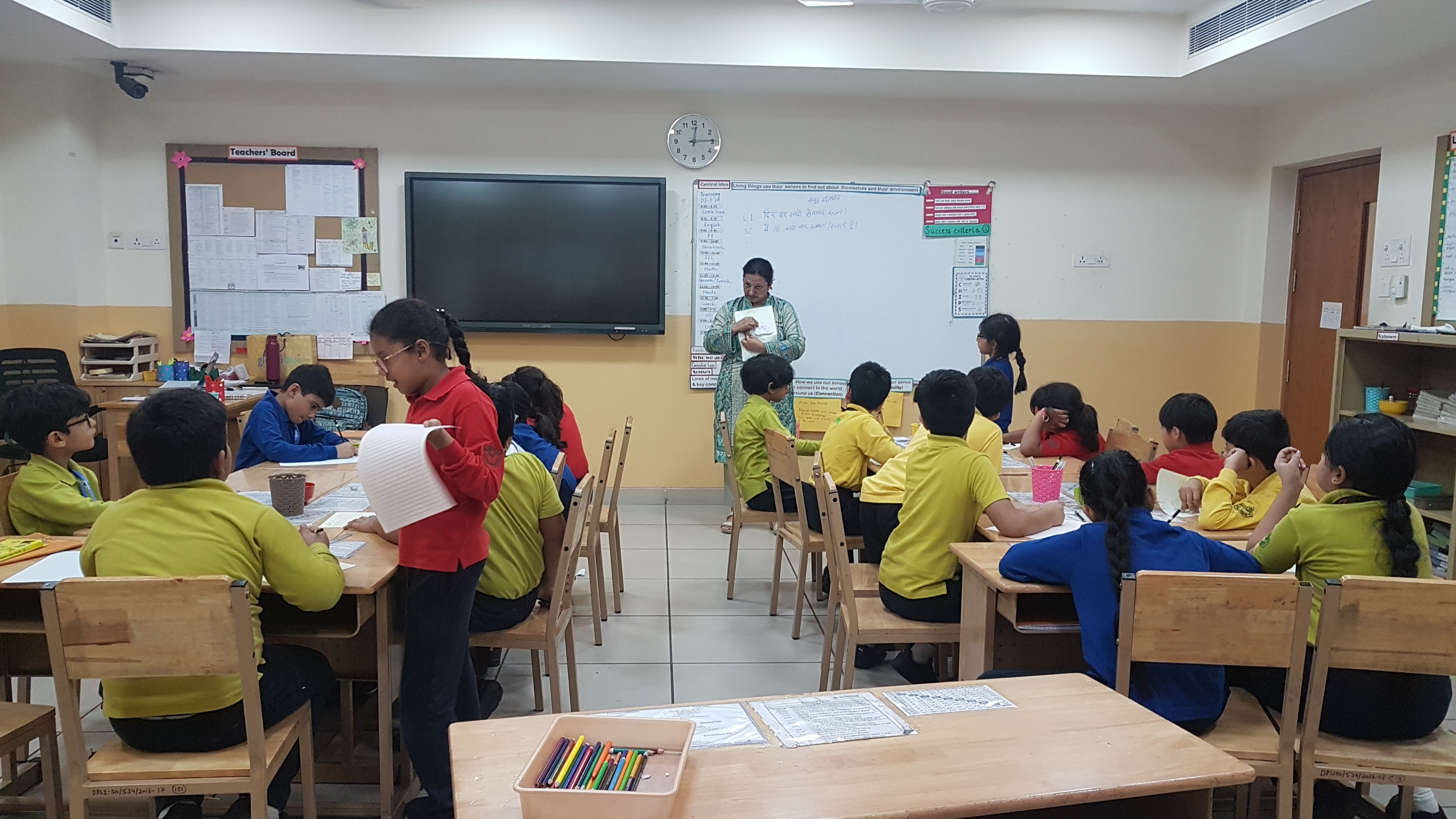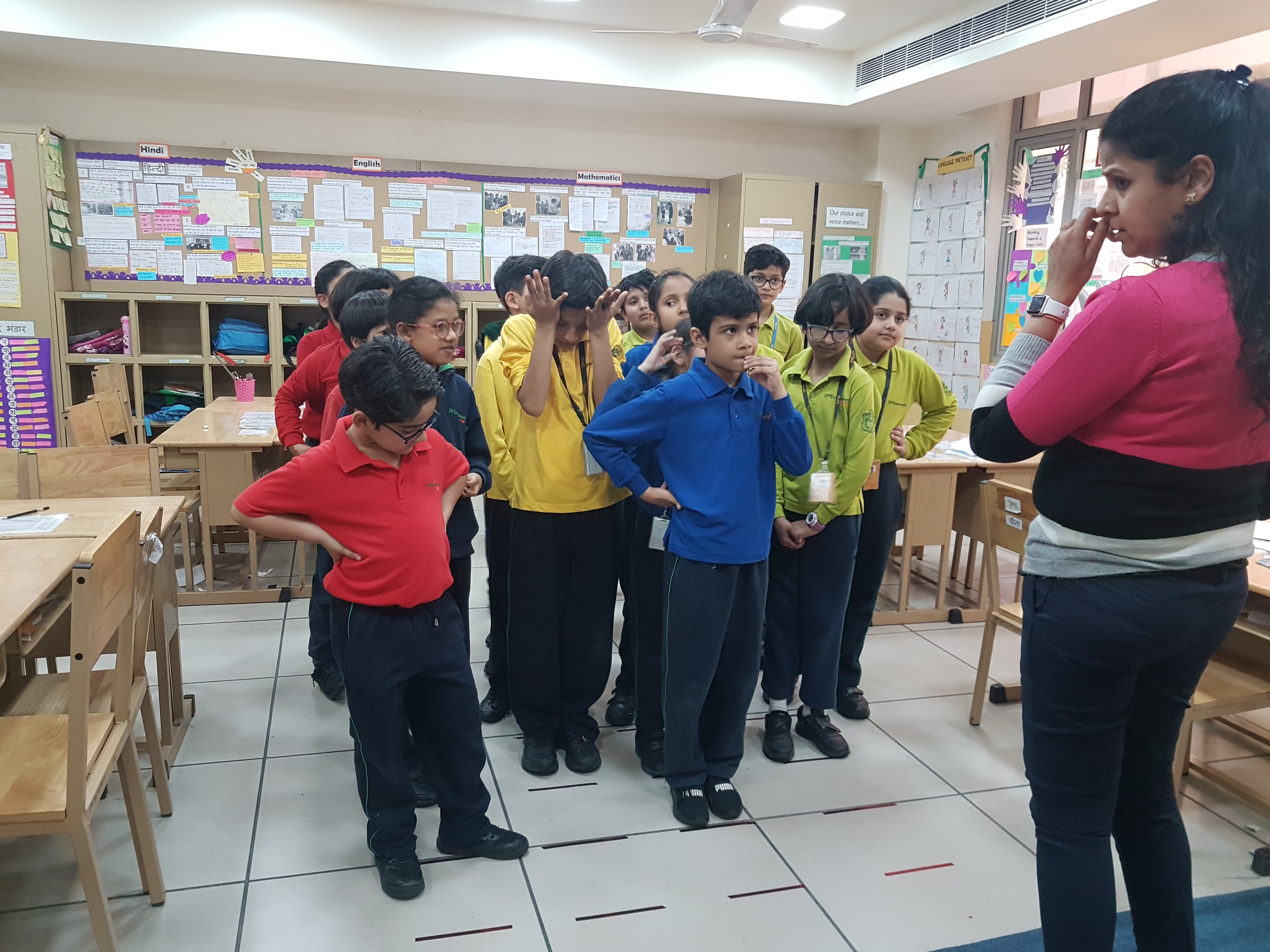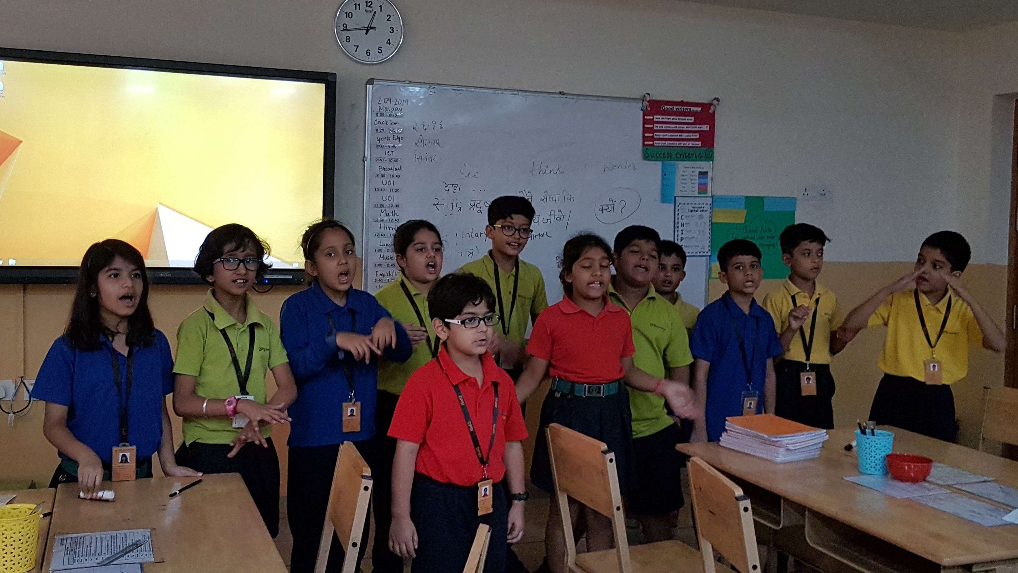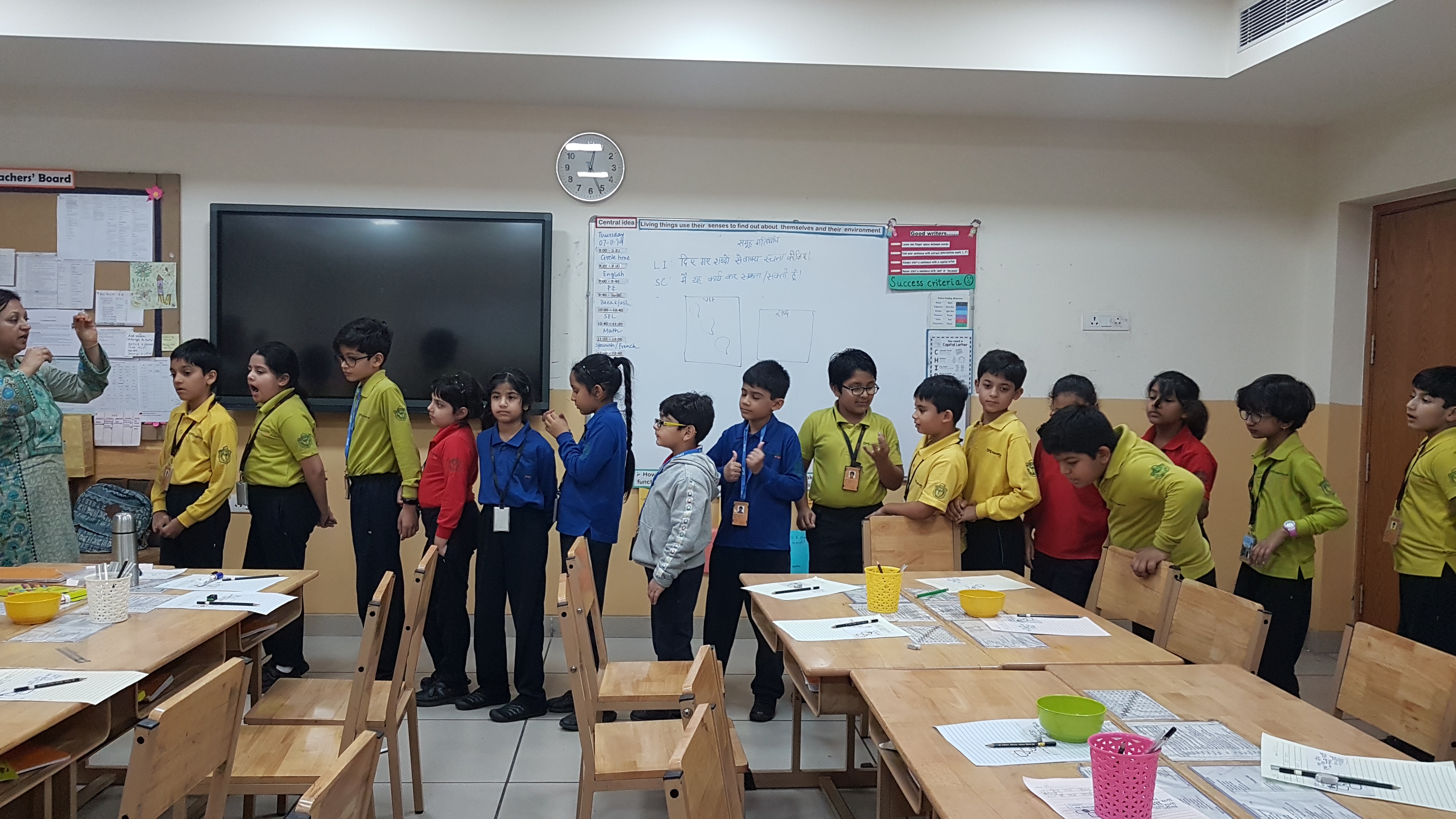 In their Hindi lesson students presented prior knowledge on sense organs through role play and a visual thinking routine ‘Think-pair-share’. They enhanced their communication skills and visual imagery by listening to and reading a poem. They picked up naming words from a given picture and revisited grammar concepts वचन (singular-plural).