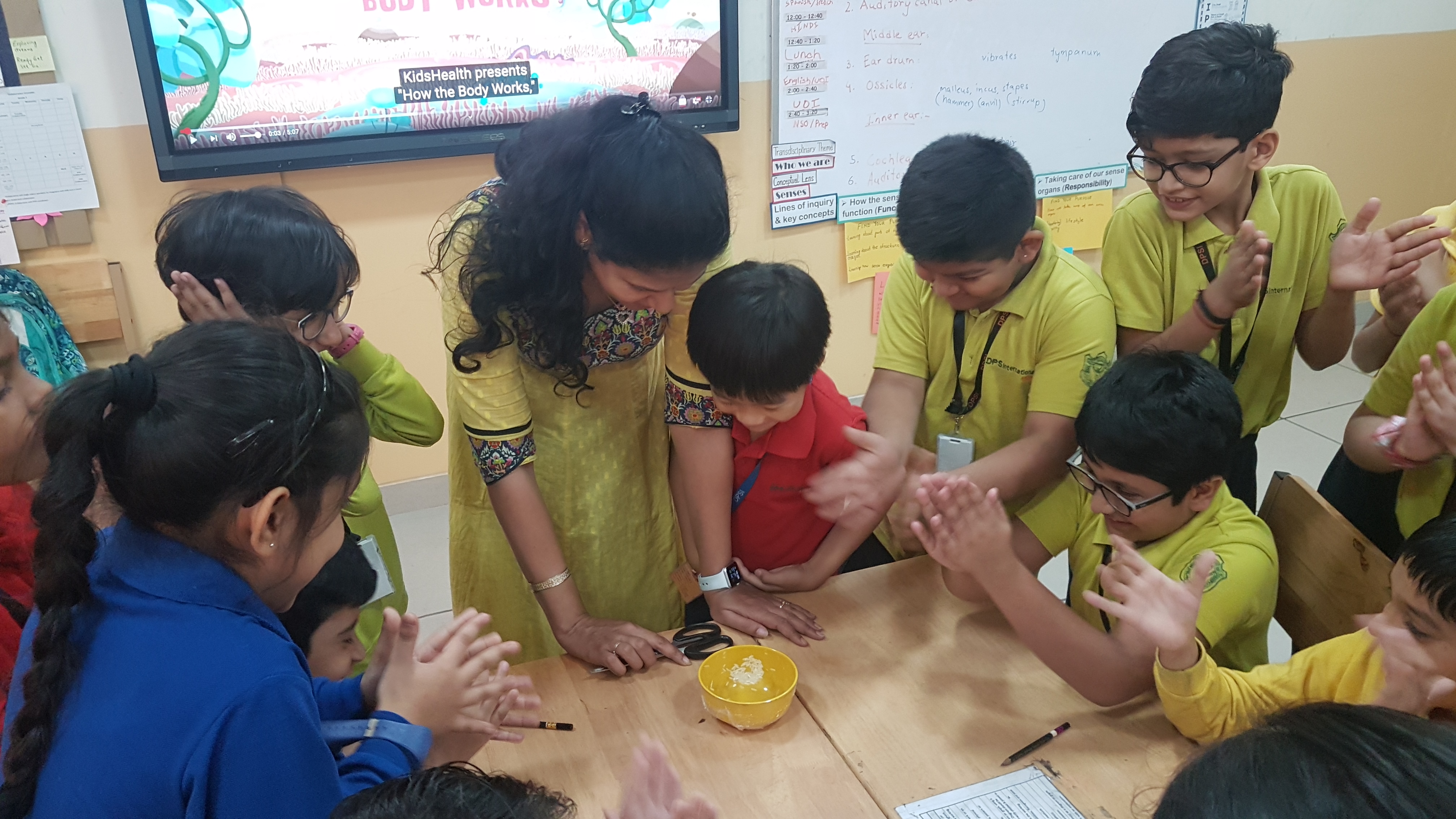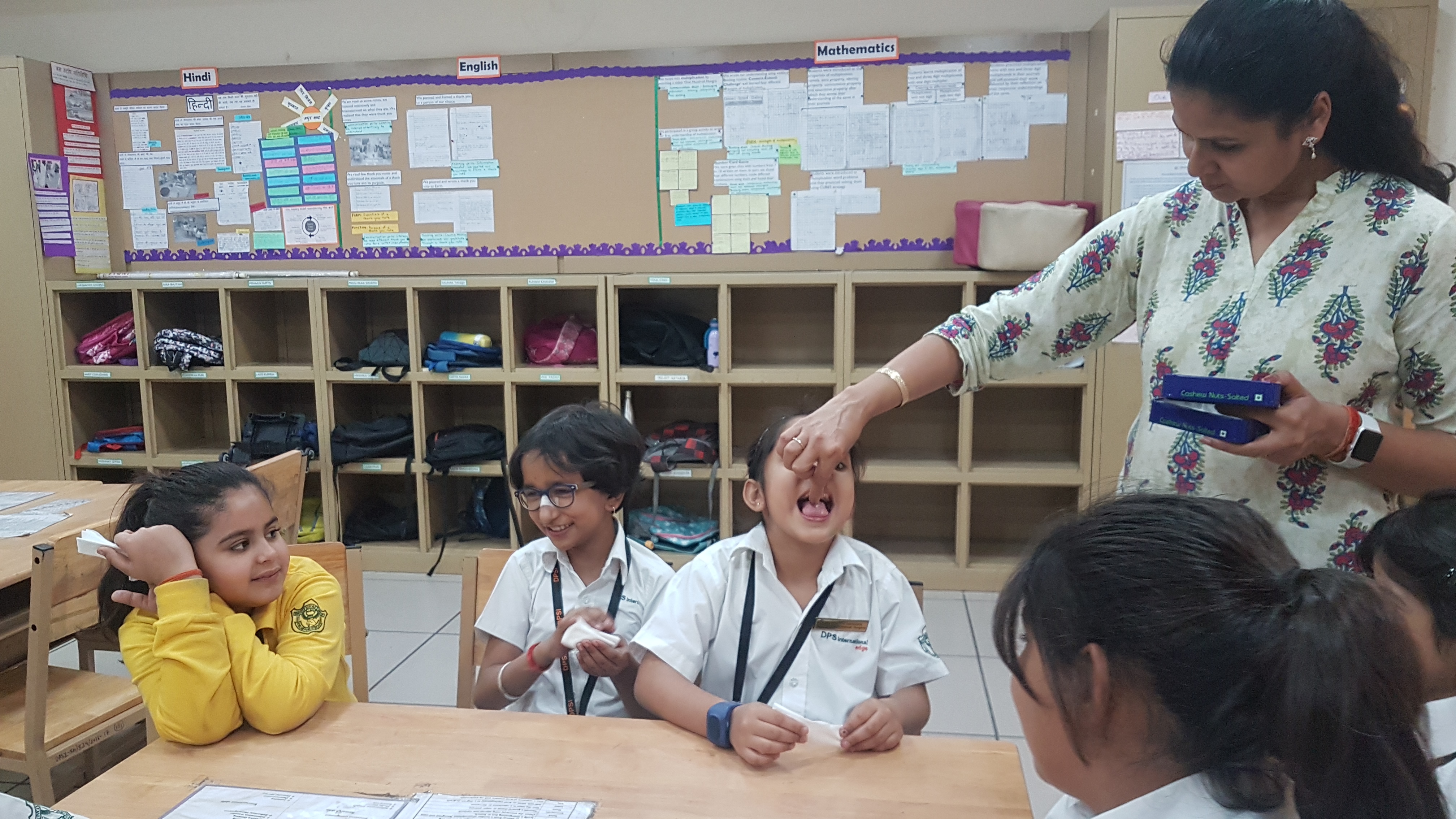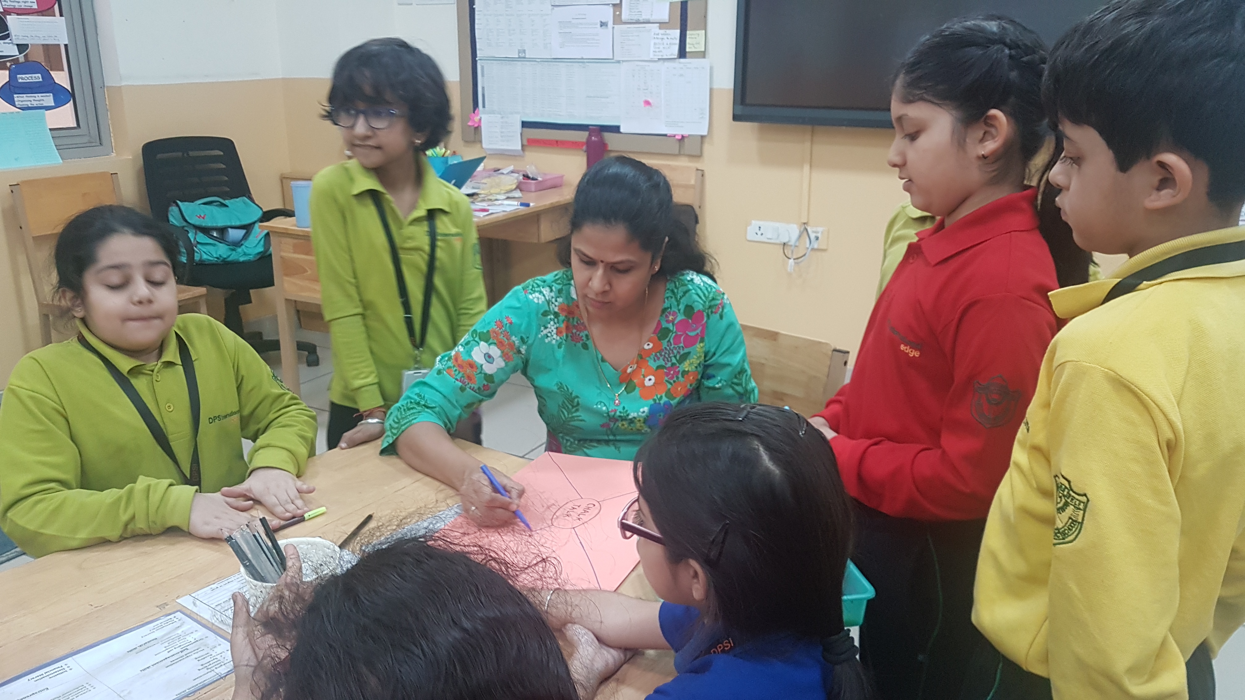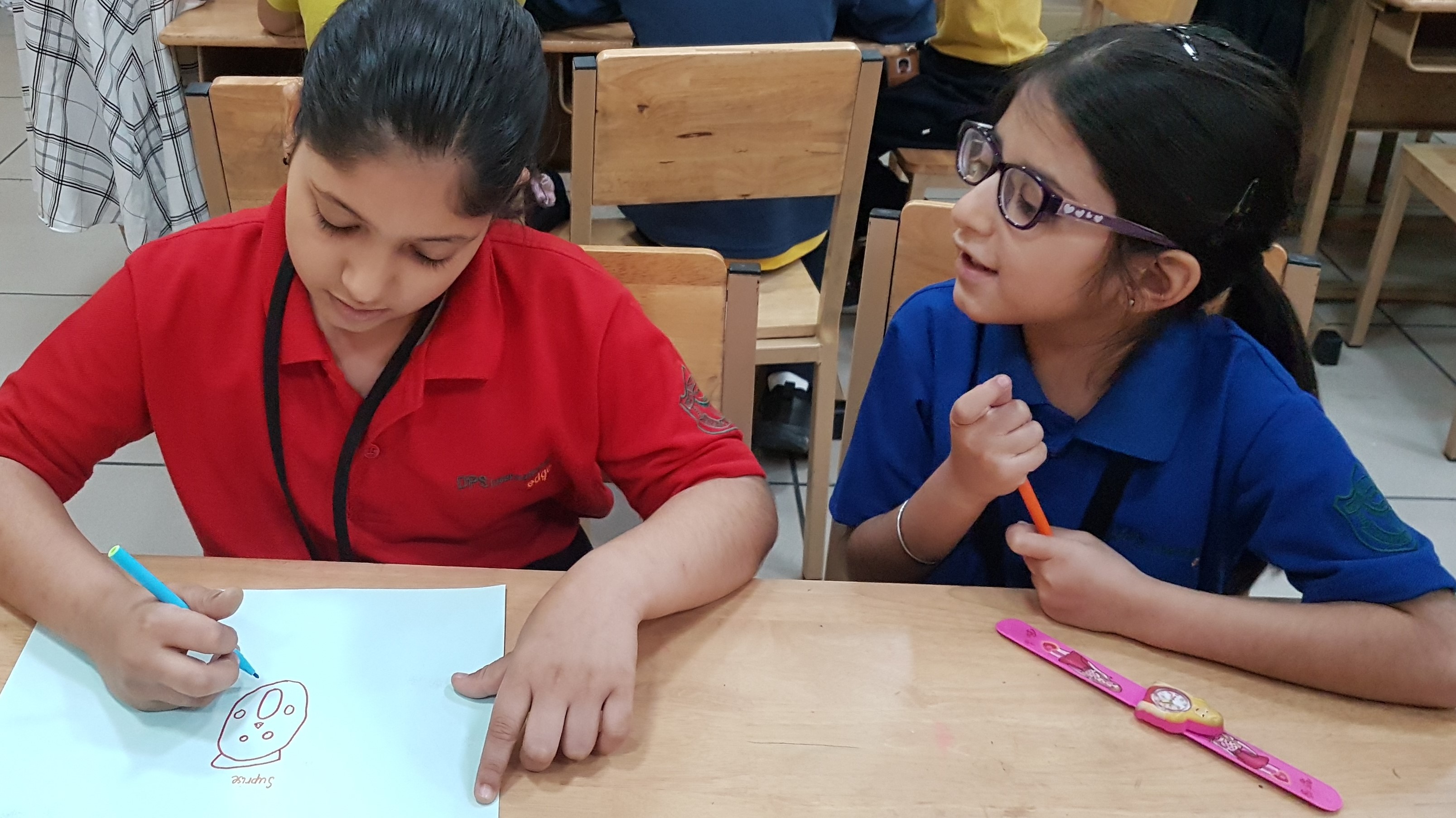 In their Hindi lesson students presented prior knowledge on sense organs through role play and a visual thinking routine ‘Think-pair-share’. They enhanced their communication skills and visual imagery by listening to and reading a poem. They picked up naming words from a given picture and revisited grammar concepts वचन (singular-plural).