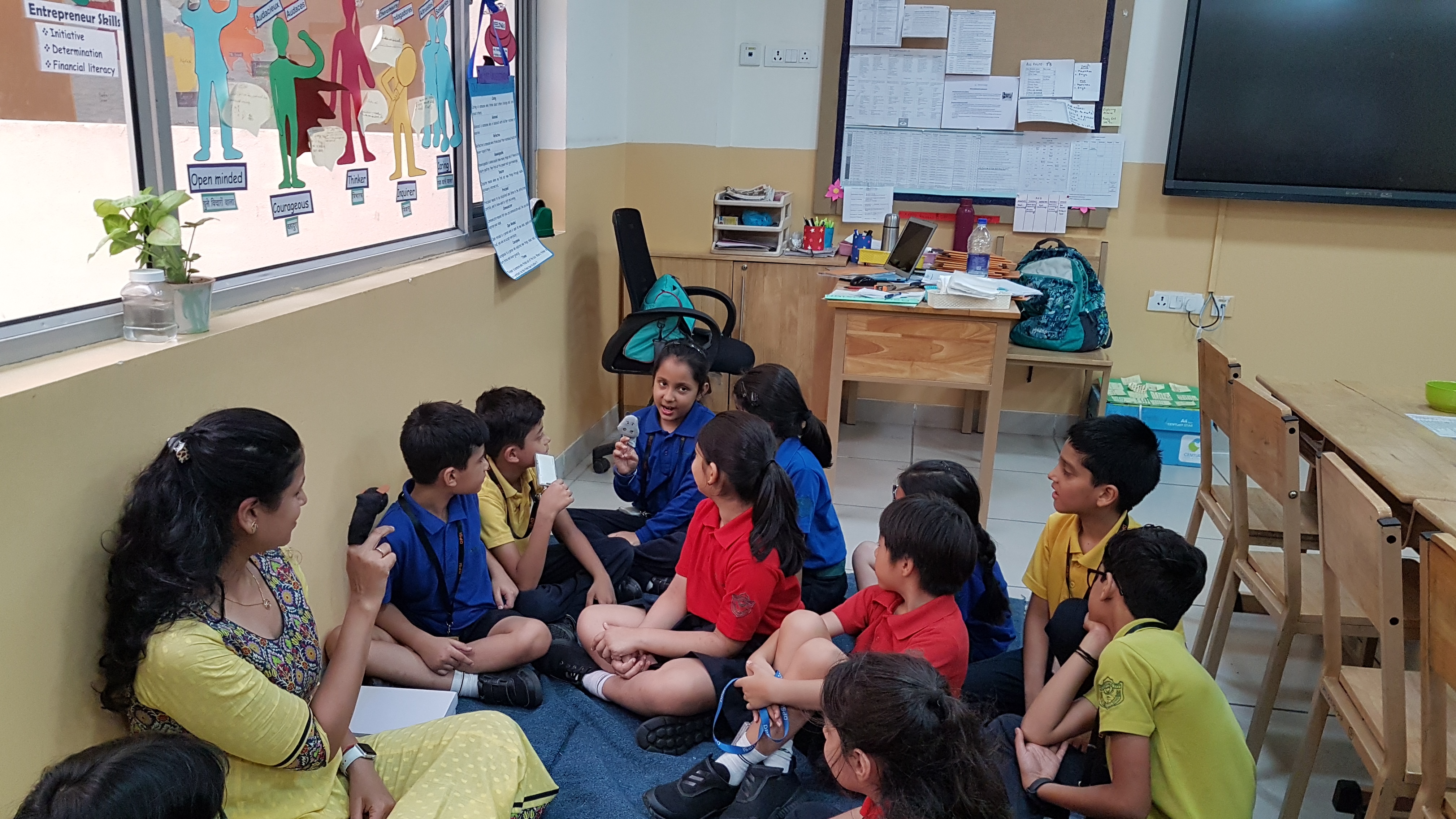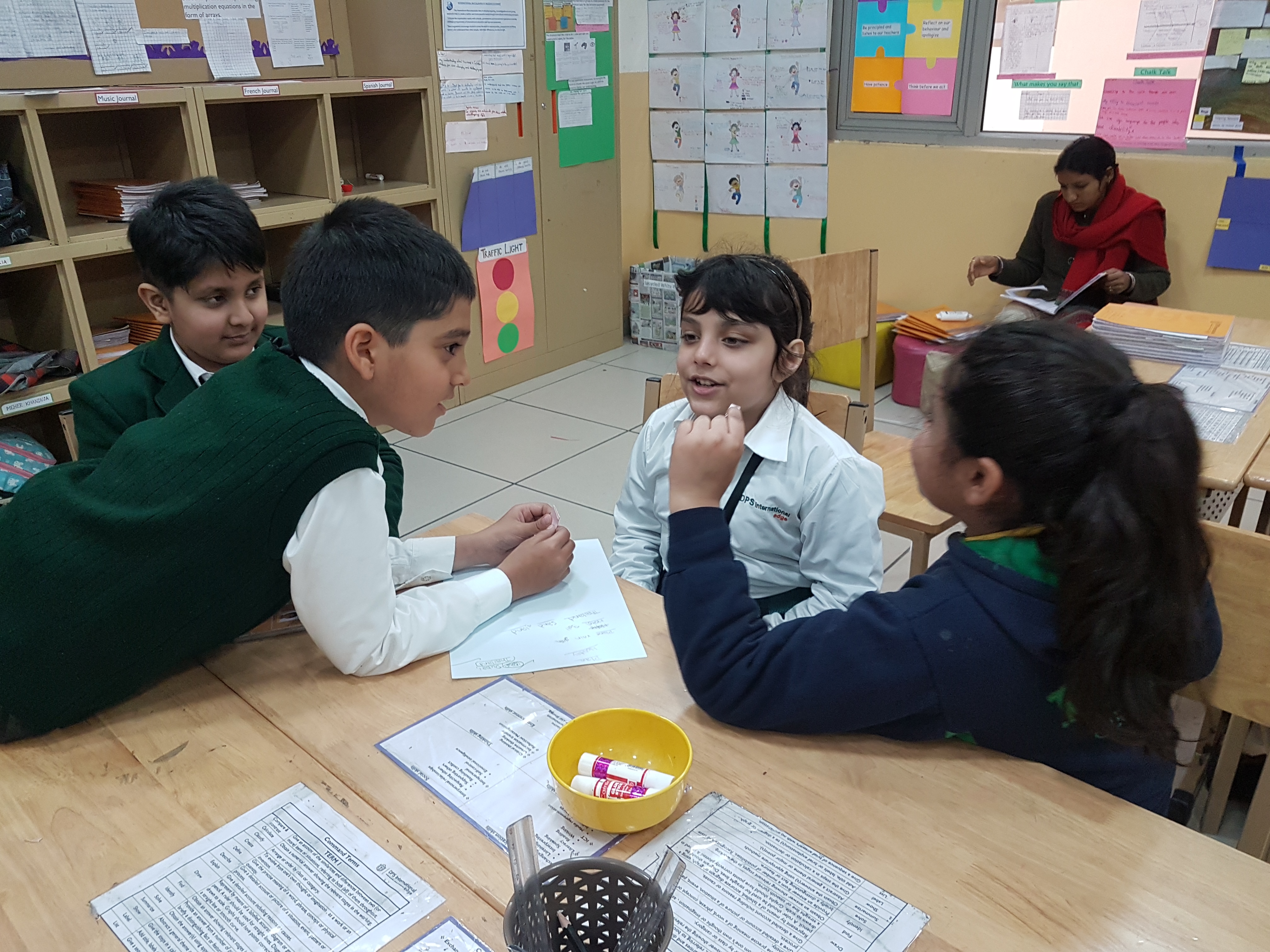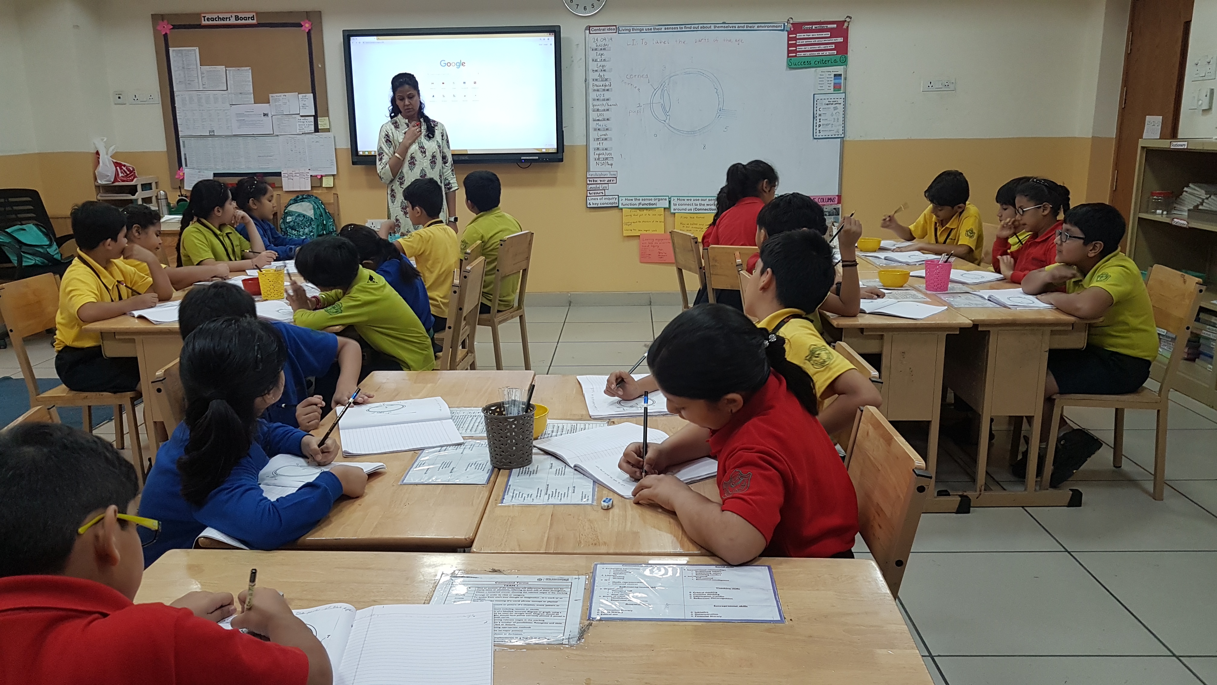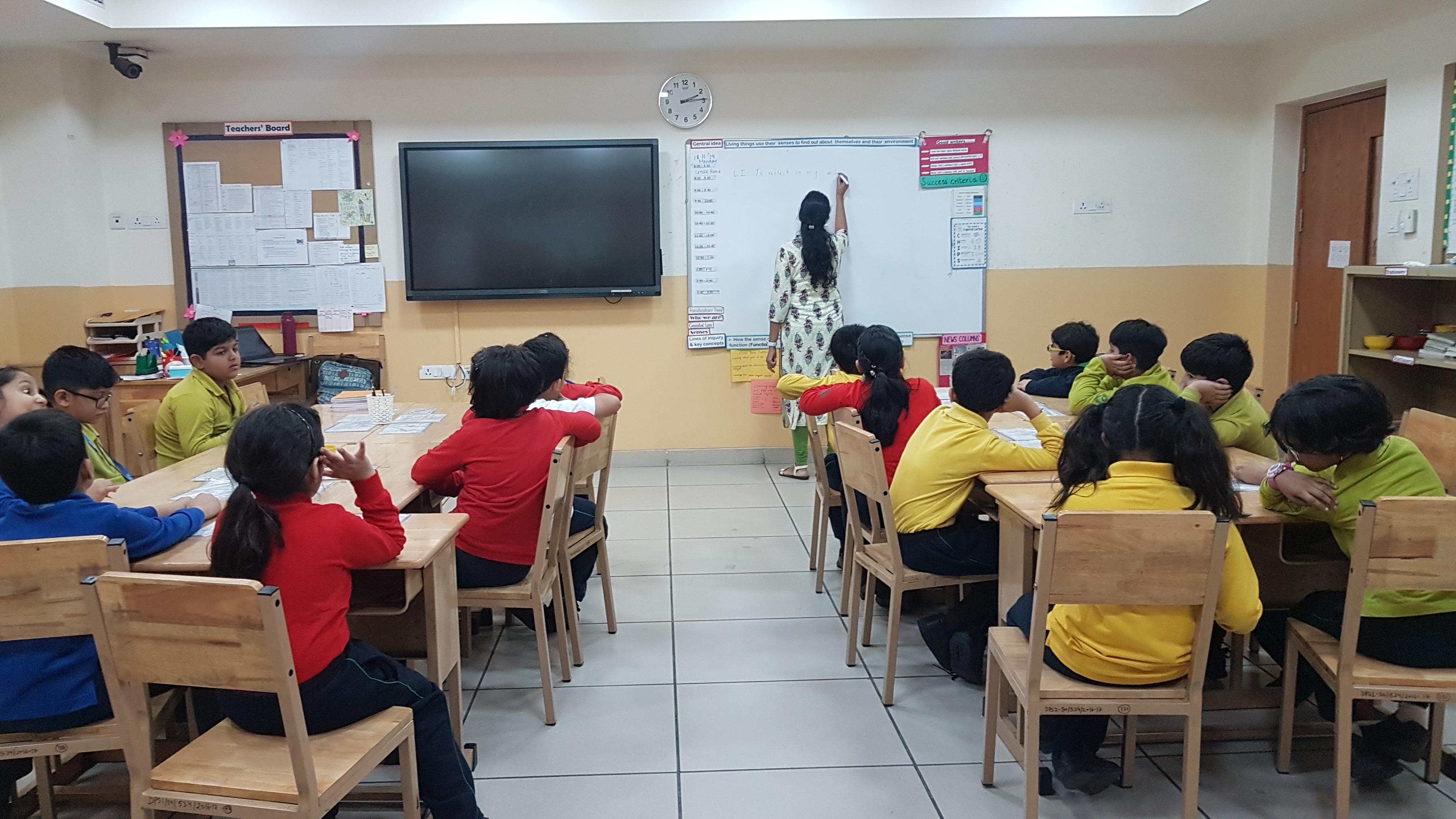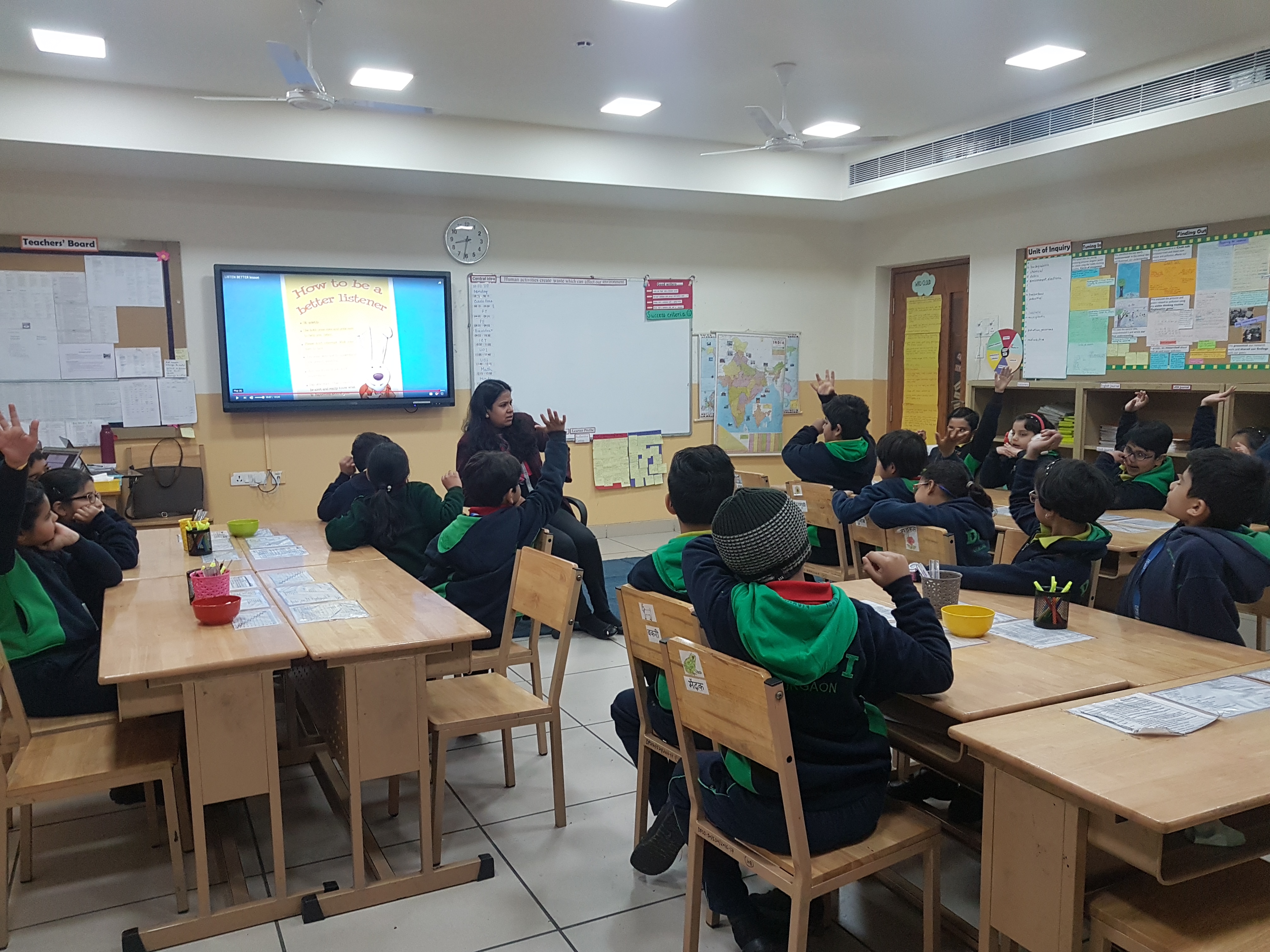 In their Hindi lesson students presented prior knowledge on sense organs through role play and a visual thinking routine ‘Think-pair-share’. They enhanced their communication skills and visual imagery by listening to and reading a poem. They picked up naming words from a given picture and revisited grammar concepts वचन (singular-plural).