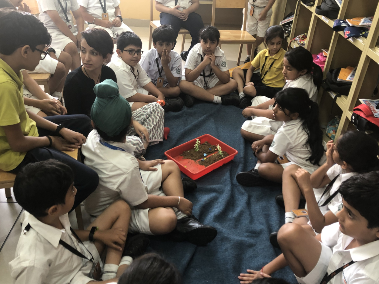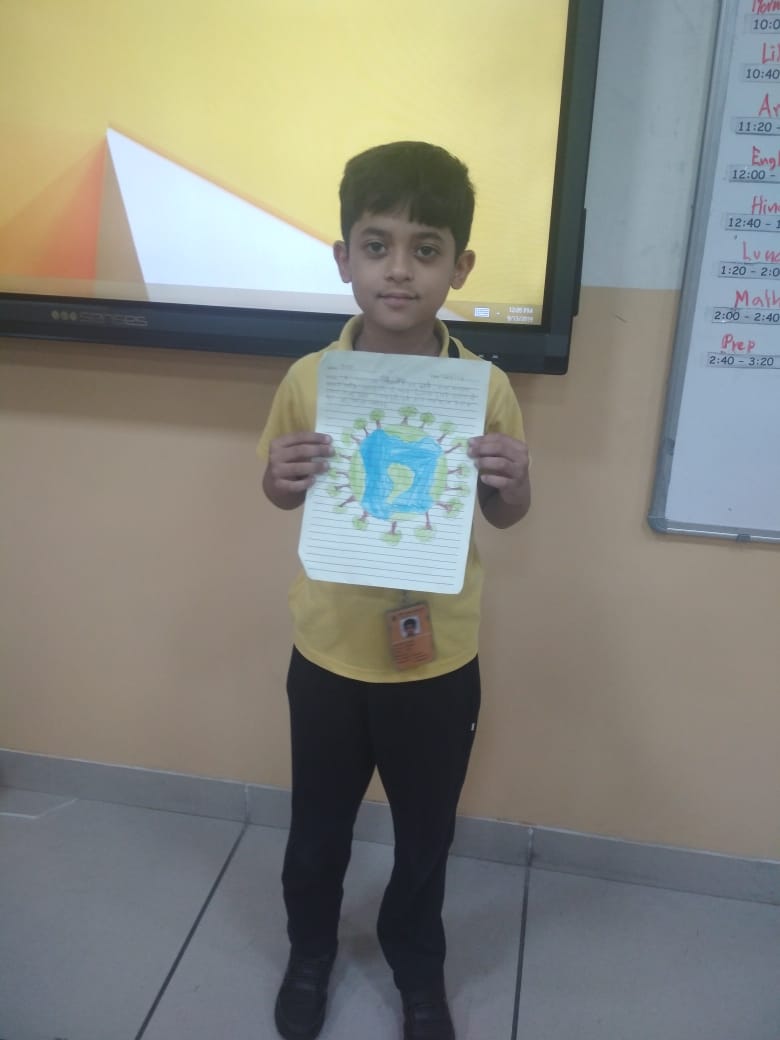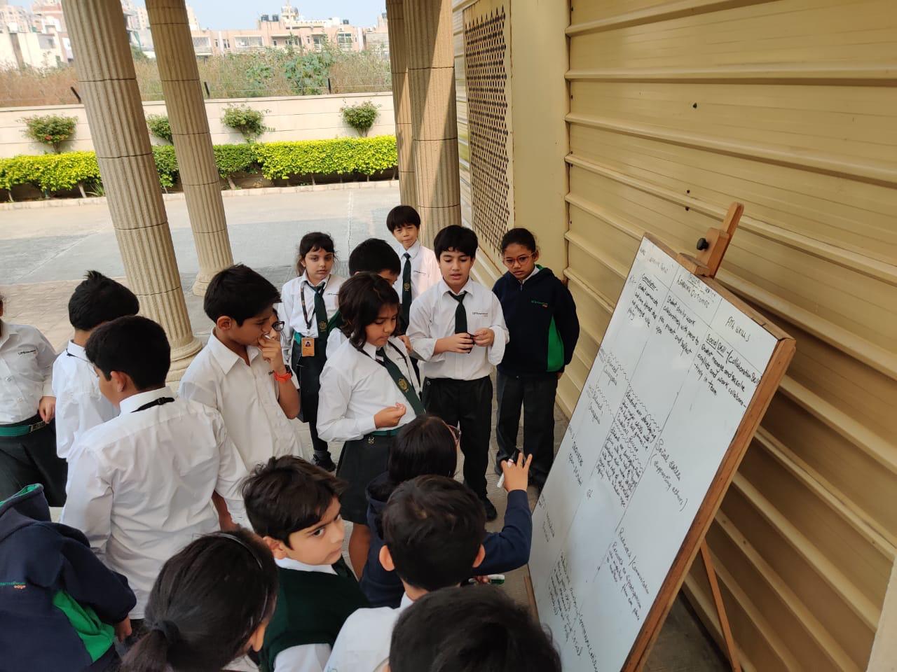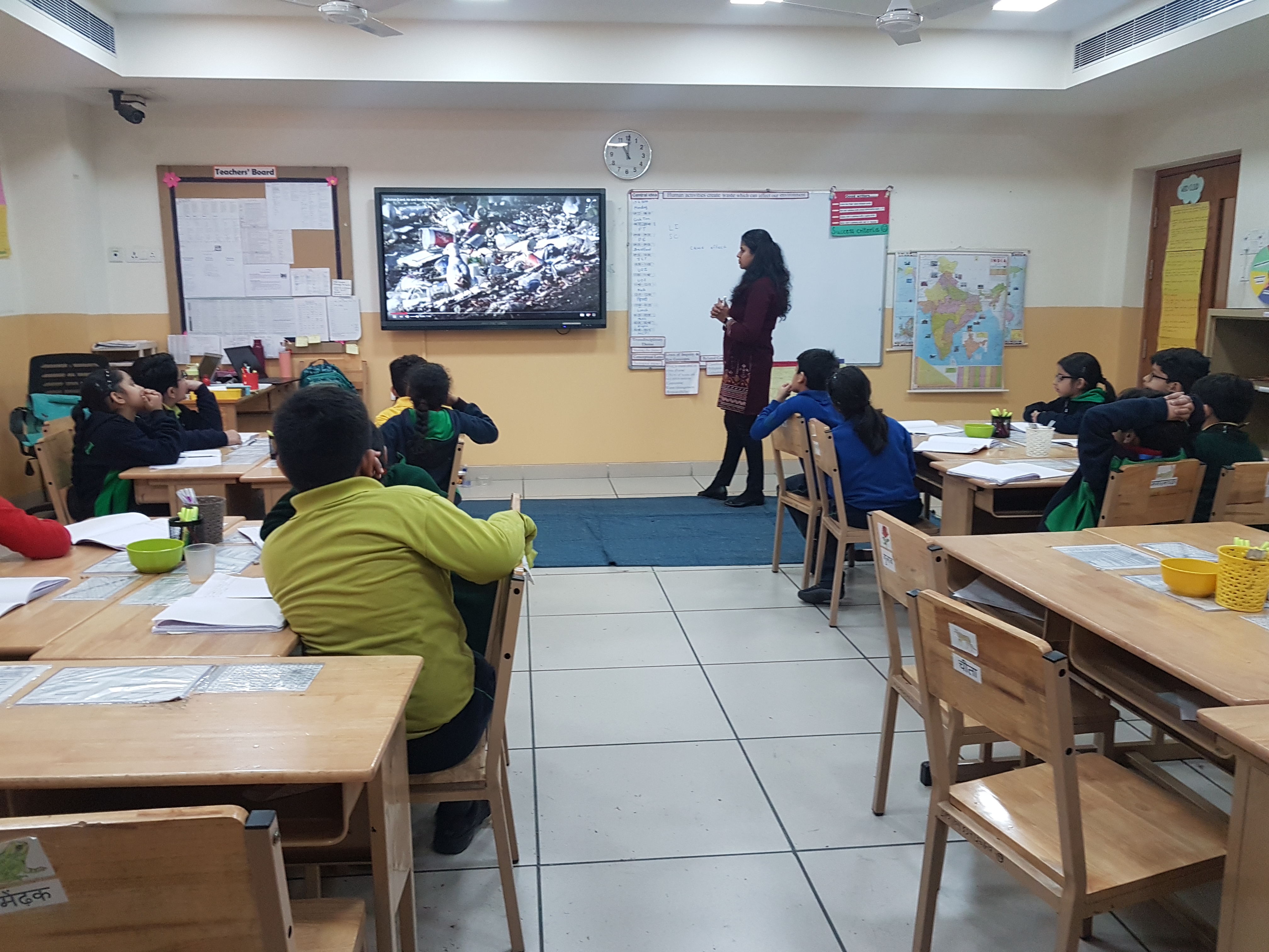 In their Hindi lessons, students watched news segments on water pollution, ’तेरा कचरा तुझको अर्पण’ and attempted a ‘Listen and Tell’ activity. They celebrated ‘Hindi Diwas’ based on the theme ‘Sustainability’ where students initiated a movement to save paper and will take the initiative to audit wastage and recycling throughout the year. They also read the story ‘मिनामाटा की कथा’ (Minamata kee Katha) and enhanced their reading skills. Later, a ‘Chalk and Talk’ activity was performed where questions were framed and discussed with classmates.