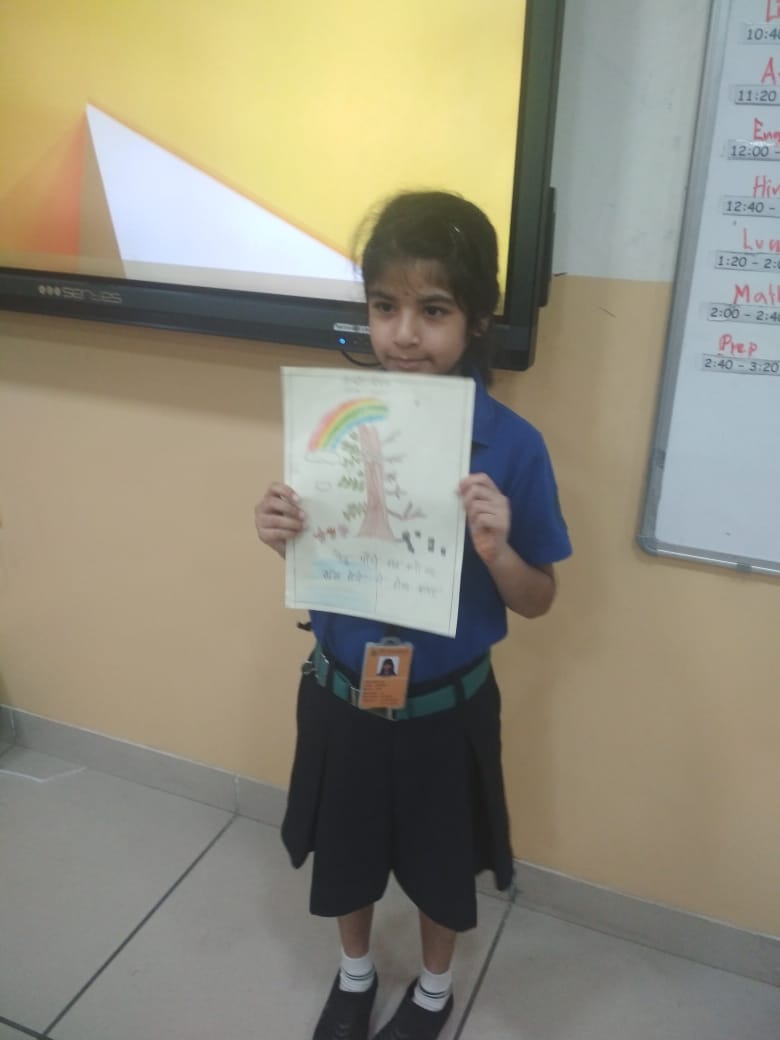 To enhance their writing skills the students wrote bina maatraa wale shabd. They also watched the Hindi stories ‘Chatur khargosh aur sher’ and ‘Jaaduee pencil’. They also heard the Hindi story ‘Kudatee zuraaben’. They celebrated Hindi Diwas by creating posters to create awareness about how everyone can save paper.