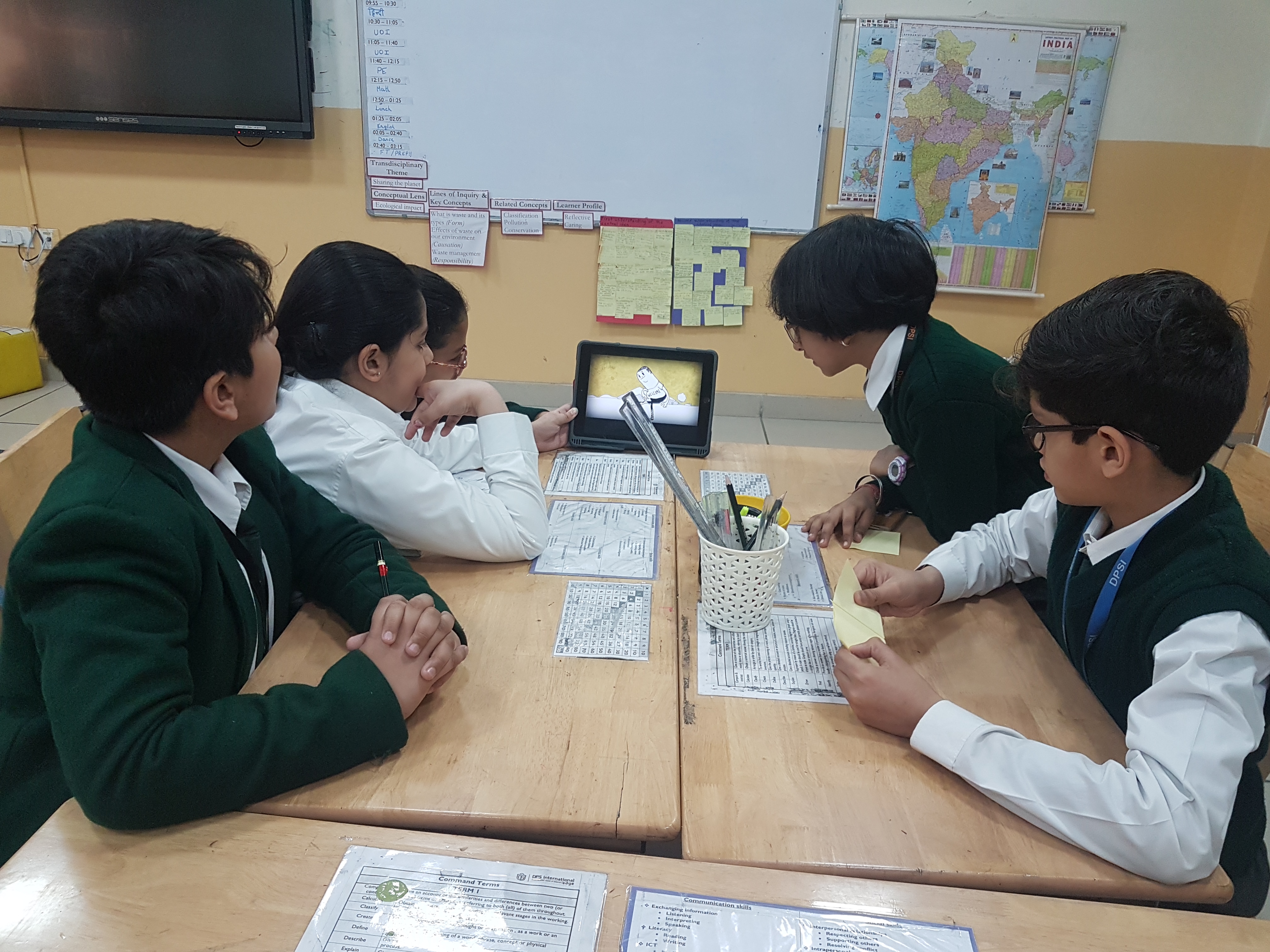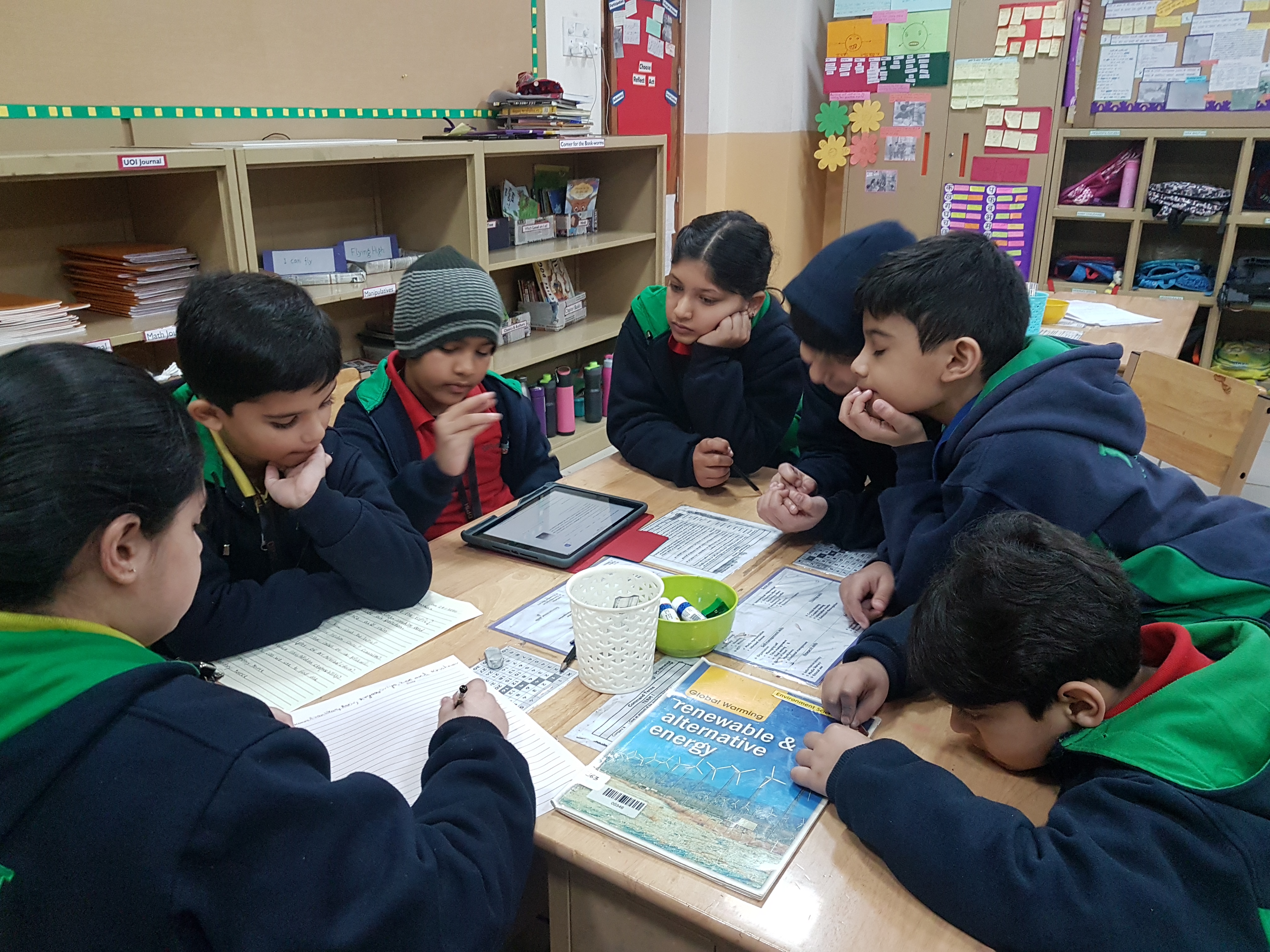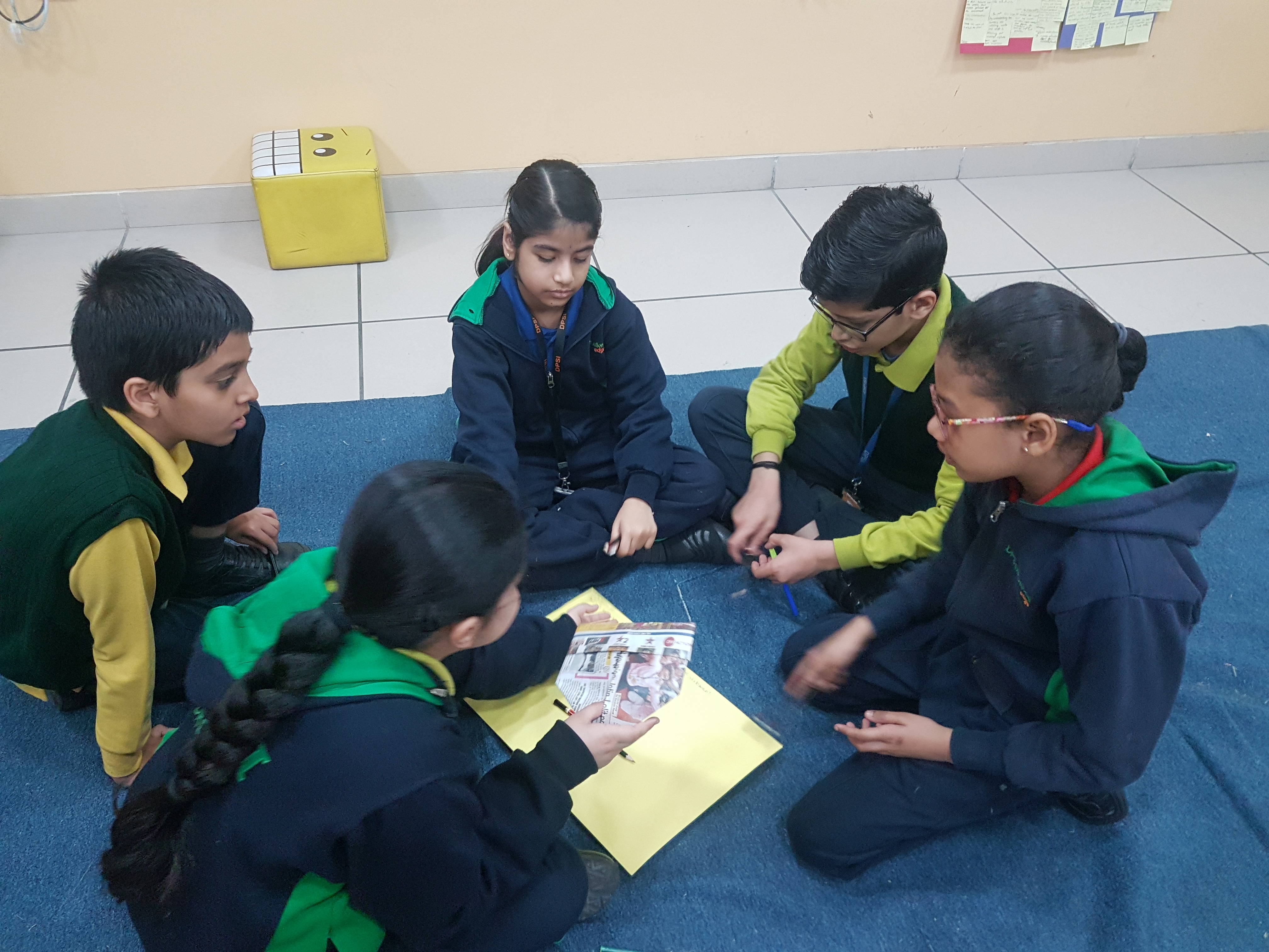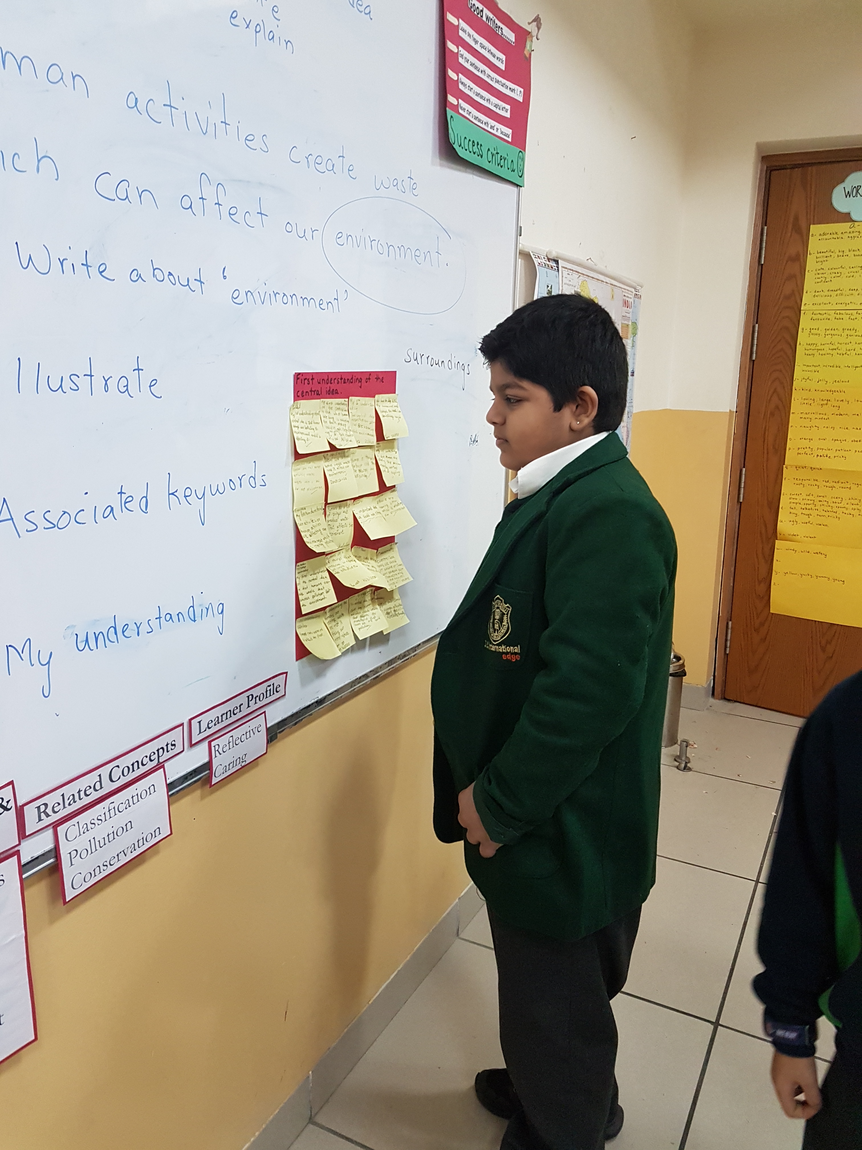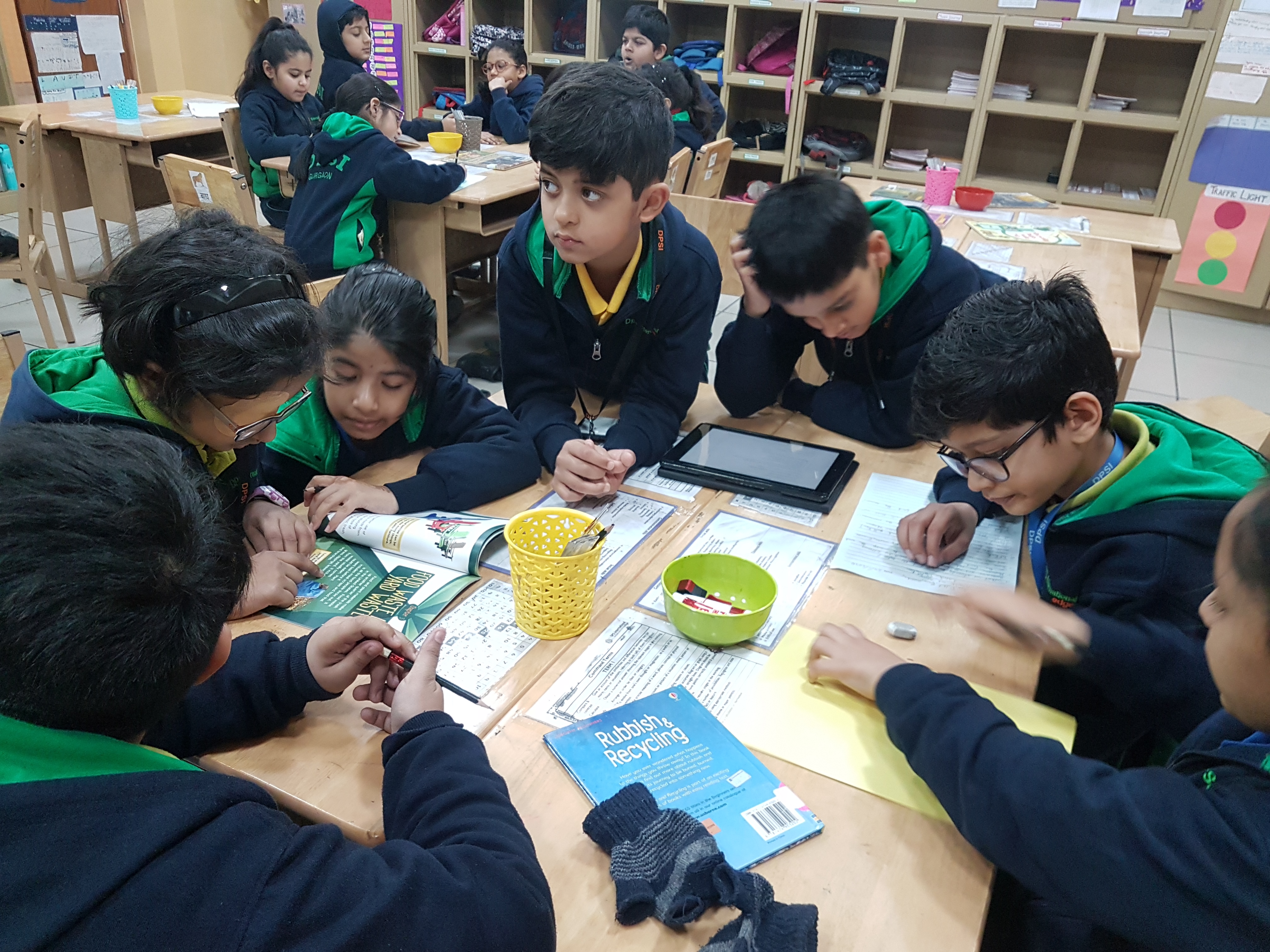 The new unit on ‘Waste’ was introduced to third graders. The students divided themselves into three groups to observe images on waste, analyse slogans or read a poem on waste. They were given the liberty to opt for whatever category they liked and brainstormed different perspectives to enhance their understanding of each. This was followed by an activity where students read the central idea, identified the keywords, discussed their meaning and wrote their first understanding. They then illustrated their perception of the word ‘environment’. Using the strategy of ‘Chalk Talk,’ they discussed the first line of inquiry ‘and recorded their comprehension in the form of a mind map. Working in groups, students had to plan their research on air, water or land. They presented their findings in class and collated notes on all three types of waste. They revisited the central idea and wrote their second understanding on the unit.