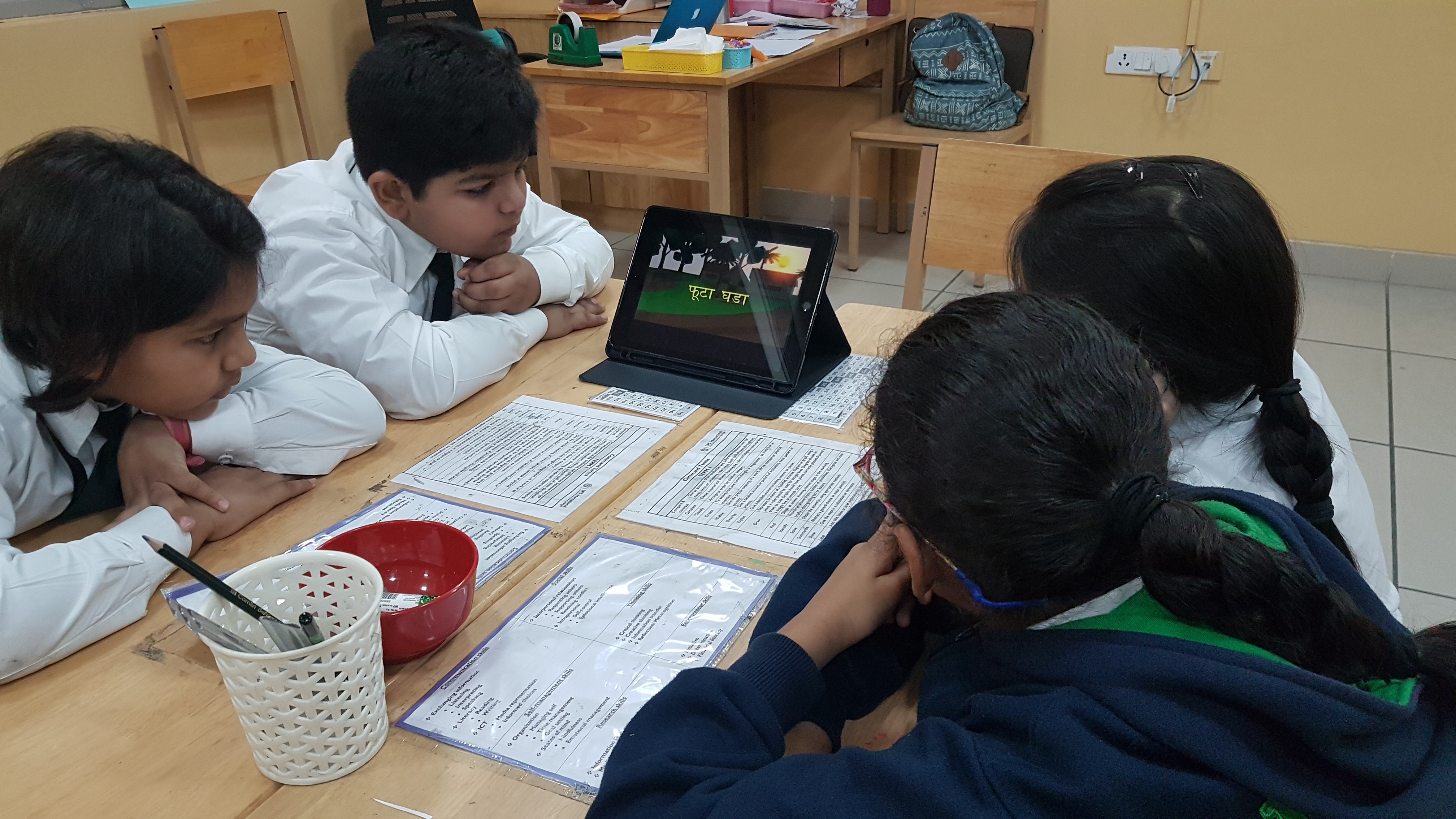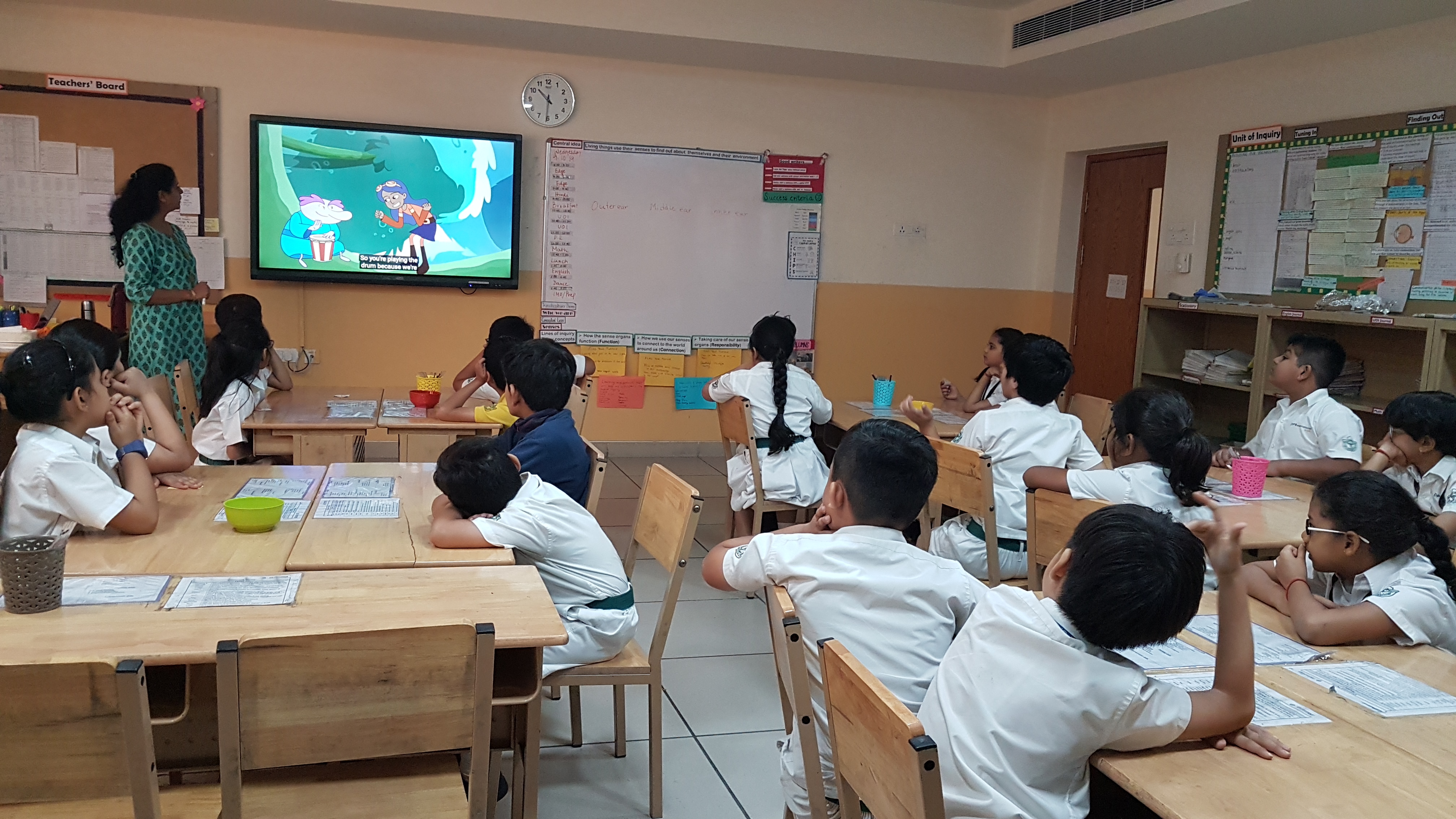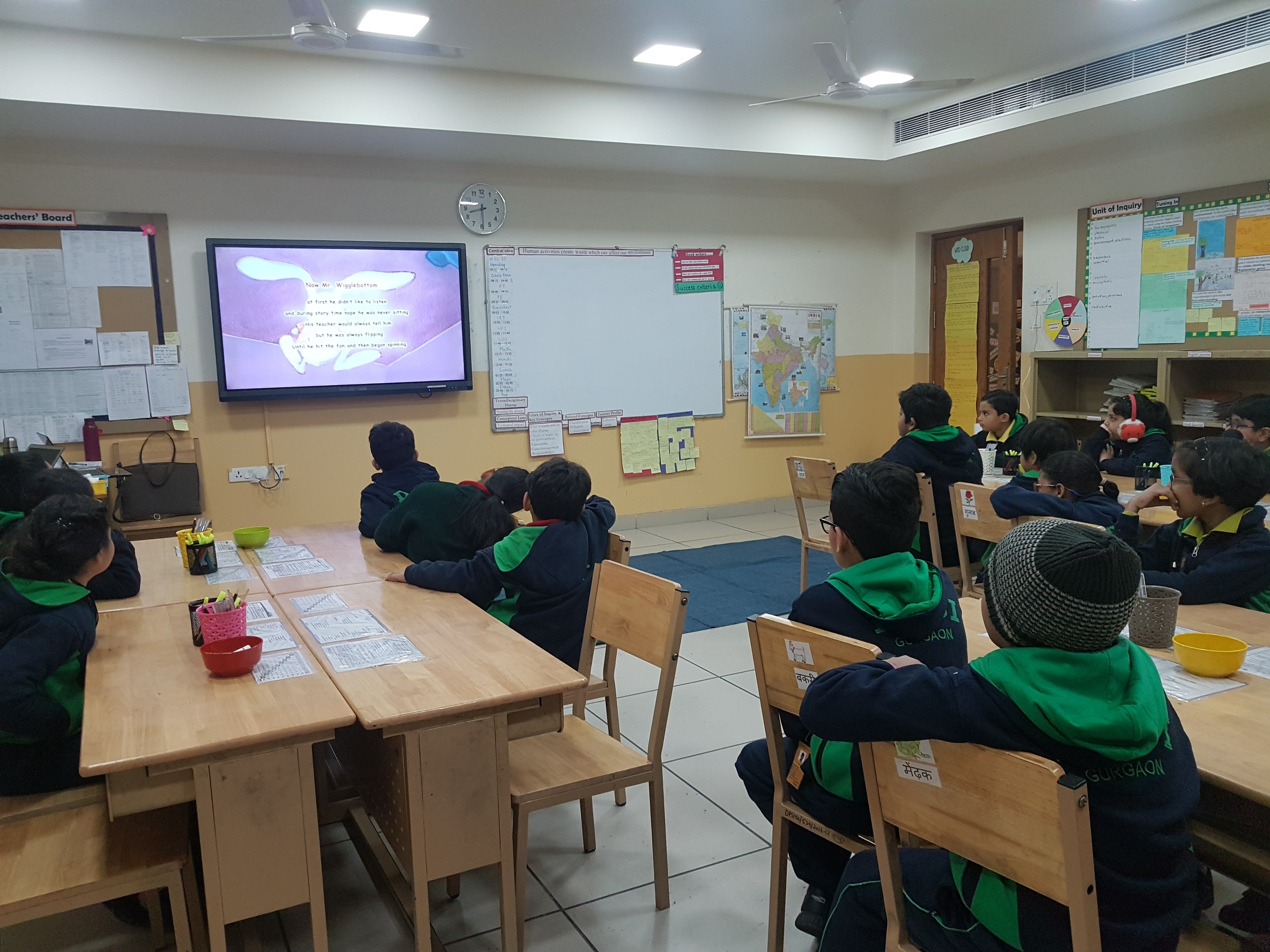 To enhance their listening skills in Hindi the students listened to a story named ‘Tota’ and watched the Hindi stories ‘ Sher ki khaal mei gadha ’ and ‘Boltee gufaa’.