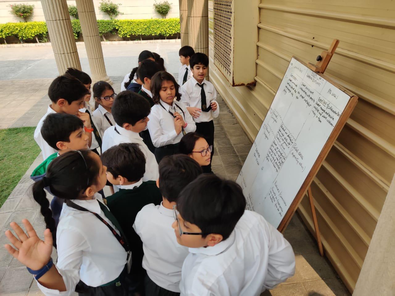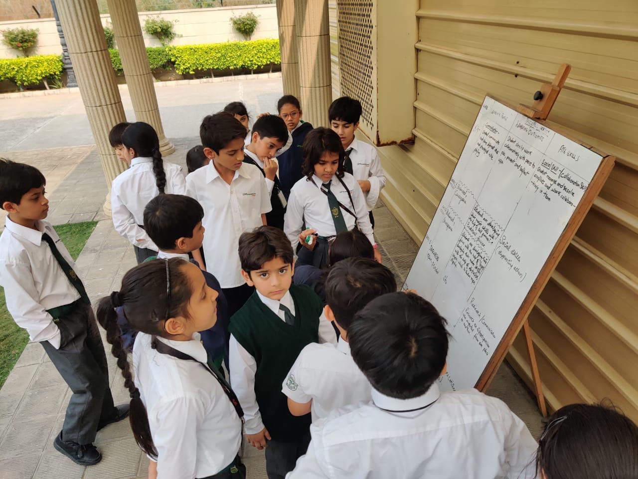 Students continued with their lessons on waste management with a visit to the sewage treatment plant in school and recorded their experience using procedural writing or a flow chart. This was followed by a group activity where they visited different areas of the school as part of small groups. They investigated and collected evidence (pictures) of various types of waste created in these places. They then analysed the pictures using a visual thinking routine of their choice. Students did a chalk talk activity where they analysed a valuable statement from stories read earlier and formed their opinion of the same. In the waste management lesson, they finished off by knowing about types of waste generated and how they can be managed. They participated in a group activity where they were given 2-3 scenarios to analyse how best waste can be managed.
