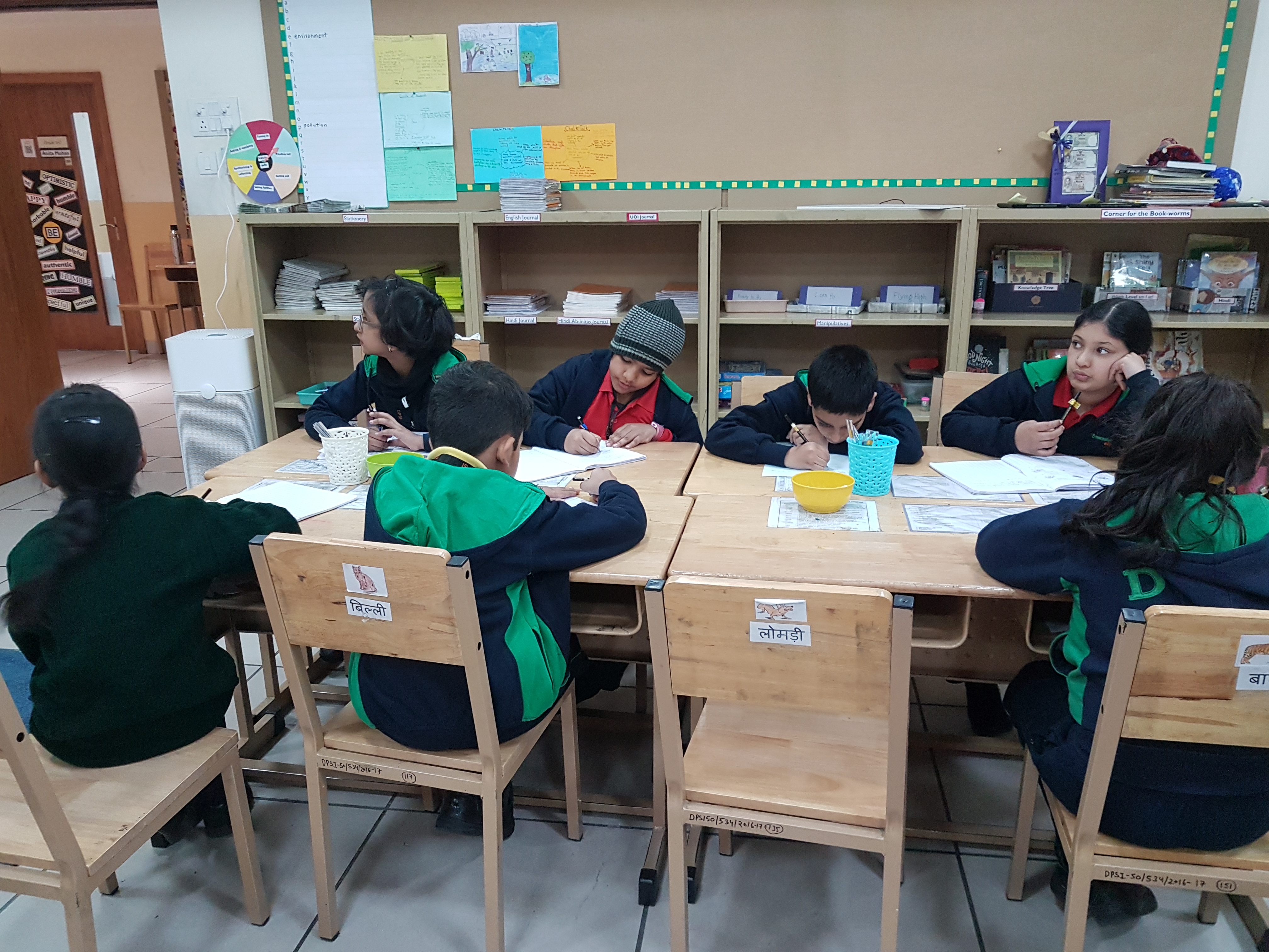 For Hindi, the students enhanced their listening skills while concentrating on the story “Abha ka Janamdin” and narrated the same to each other to improve their speaking skills. They encouraged their peers to hone their reading skills by viewing the same. They also identified words with different matras. To improve their writing skills, some wrote words from the story while others made sentences using those words. Some chose to use visual imagery. Students enacted the Hindi story “Billi ke Bachche” through role play.