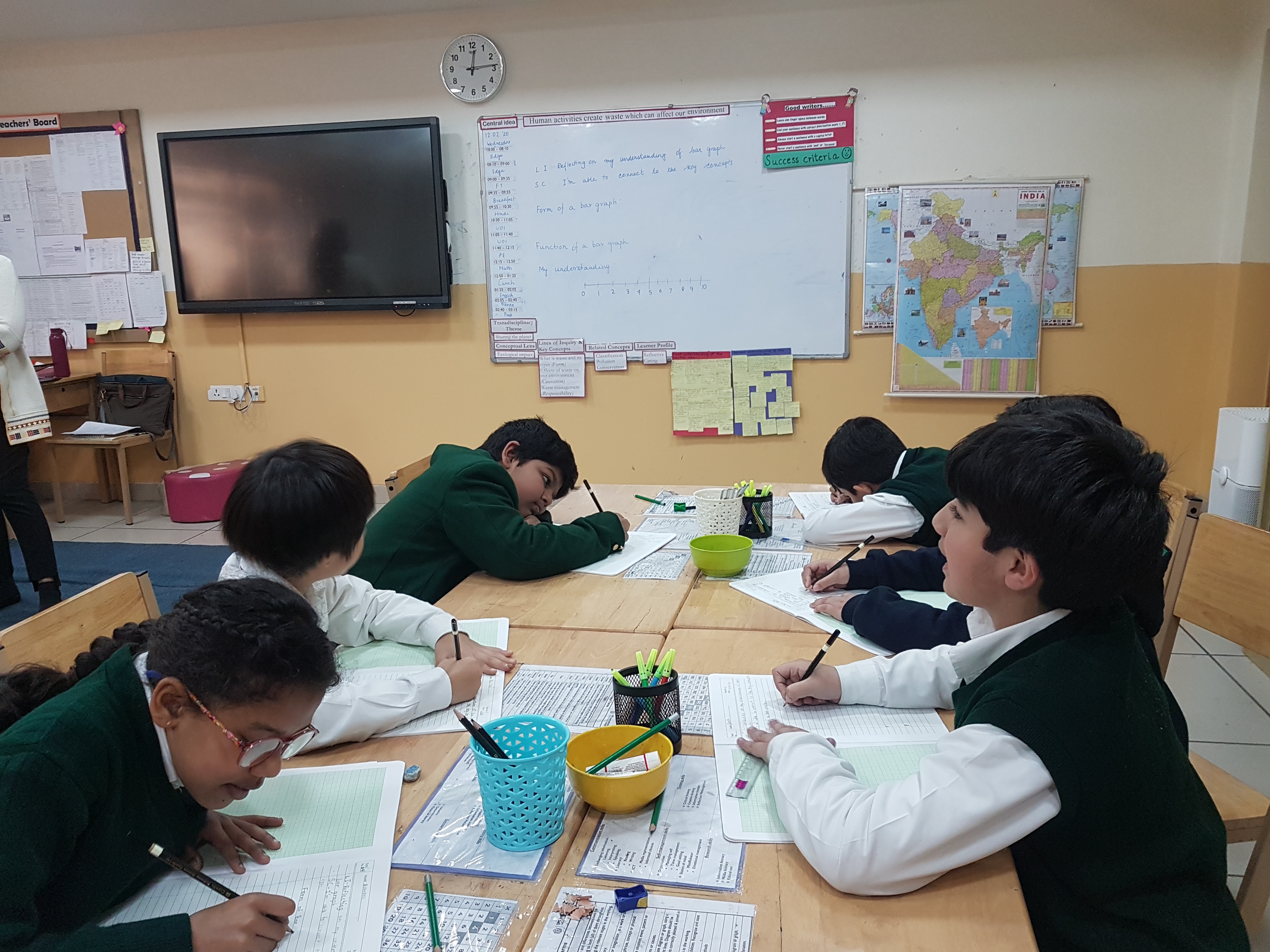 They learned about the parts of a bar graph such as title, horizontal and vertical axis, scale and bars. Representation on a bar graph with a quick poll based on the students’ favourite seasons/pets/shoe sizes was interesting. Tally marks were used and results recorded to make bar graphs. The group activity on data collection where students reviewed information and made bar graphs aided practice with labelling, plotting and analysing bar graphs by examining data on their favourite after school activity.