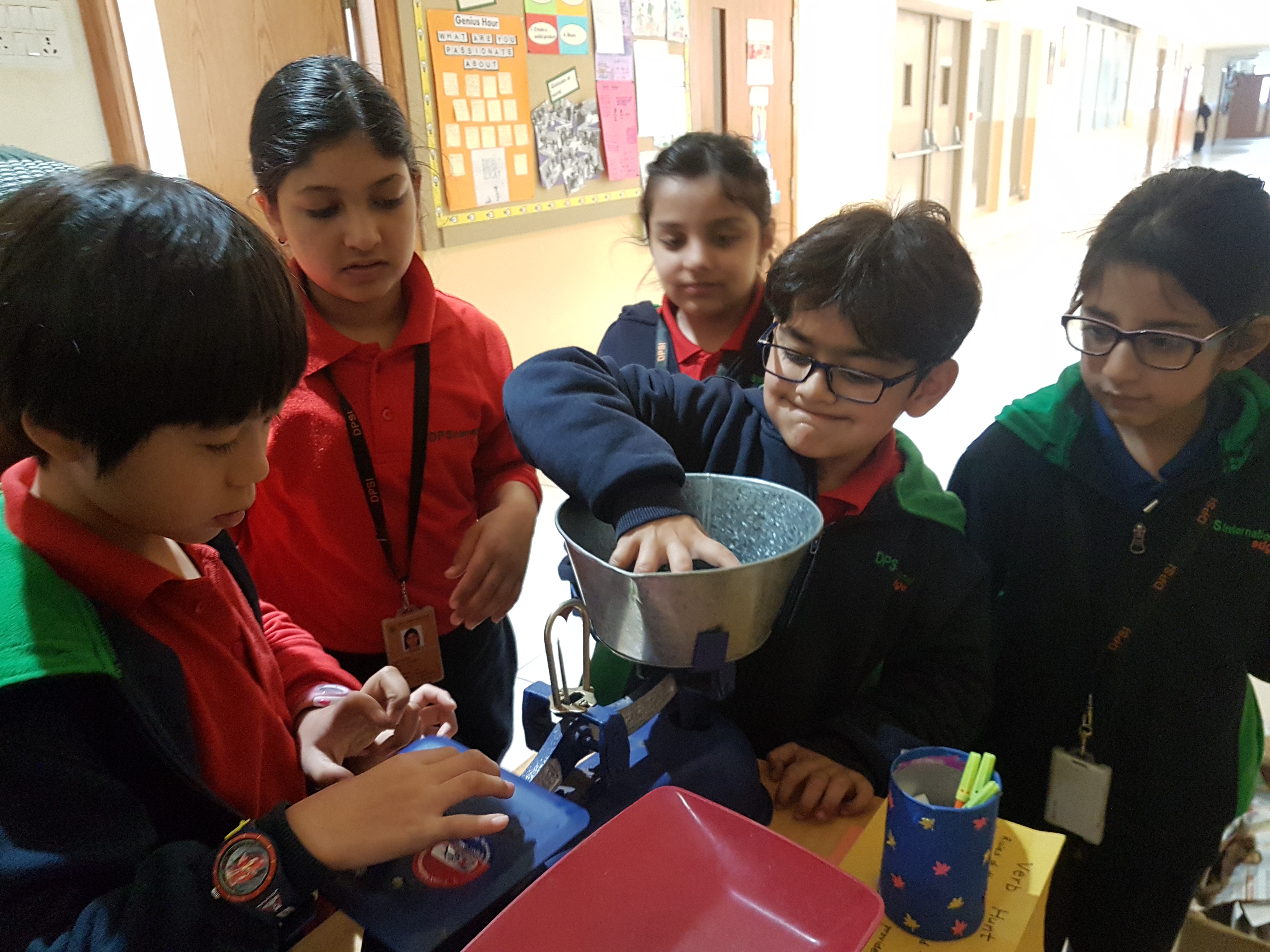 Students were introduced to weight measurement through inquiry activity. They had to guess the weight of various objects presented to them which was followed by the actual weighing of the same articles. They learned about units of weight and their application in real life scenarios. Students understood conversion of units from their mentors from Grade 4. They explored online resources and read fact sheets to further understand the concept. Three stations were set up in class for different concepts (number operations, measurement, data handling/bar graph). Students were encouraged to visit each of them to reinforce or display their understanding while challenging themselves. During practice sessions students worked on unit conversion and word problems related to measurement of weight.
