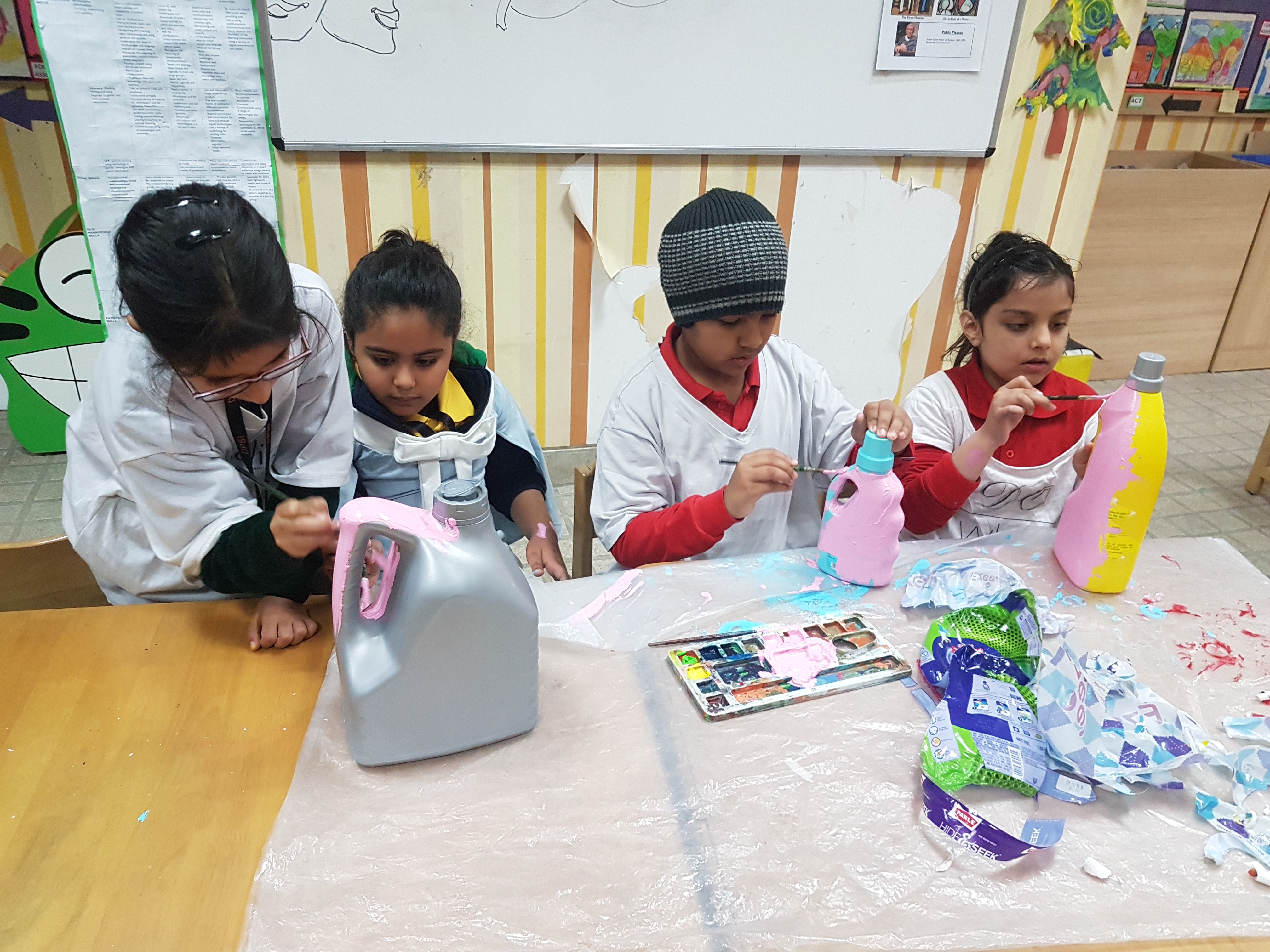 Students discussed the different types of waste materials that can be used to create artwork. They then collected various plastic bottles and have started painting them to convert them into planters. This activity gave them the opportunity to develop their painting skills as they were exposed to acrylic paints for the first time.